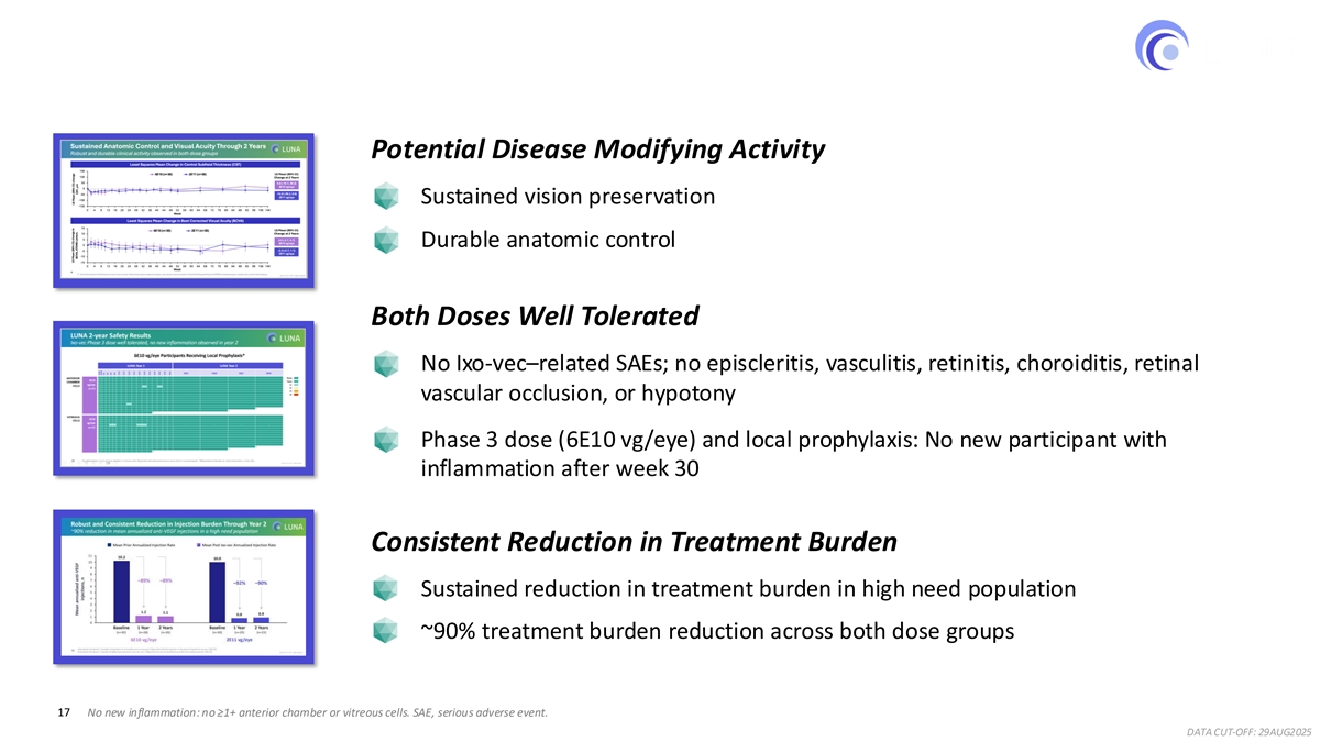 100% of Participants Receiving Phase 3 Dose + Steroid Eyedrops Alone * Preferred Ixo-vec to Prior Treatments * Was the steroid treatment Phase 3 Dose + Steroid Eyedrops you received easy to Would you prefer Ixo-vec Would you want Ixo-vec in Would you recommend Ixo- manage? over your prior your other eye if you had vec to your family Easy/Very Easy Undecided treatment(s)? bilateral wAMD? or friends? 5% 100% 100% 100% 95% † Difluprednate Only Yes No (n=20) 16 LUNA pre-specified Patient Preference Survey (week 52). *Ixo-vec 6E10 vg/eye + difluprednate only (n=10). †Includes participants receiving Ixo-vec 6E10 vg/eye (n=10) and 2E11 vg/eye (n=10). DATA CUT-OFF: 29AUG2025