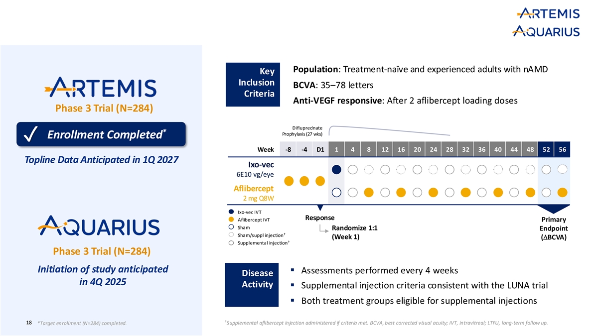 Key Findings from the LUNA Extension Study Intravitreal Ixo-vec in a high need nAMD population: 2-year Results Potential Disease Modifying Activity Sustained vision preservation Durable anatomic control Both Doses Well Tolerated No Ixo-vec–related SAEs; no episcleritis, vasculitis, retinitis, choroiditis, retinal vascular occlusion, or hypotony Phase 3 dose (6E10 vg/eye) and local prophylaxis: No new participant with inflammation after week 30 Consistent Reduction in Treatment Burden Sustained reduction in treatment burden in high need population ~90% treatment burden reduction across both dose groups 17 No new inflammation: no ≥1+ anterior chamber or vitreous cells. SAE, serious adverse event. DATA CUT-OFF: 29AUG2025