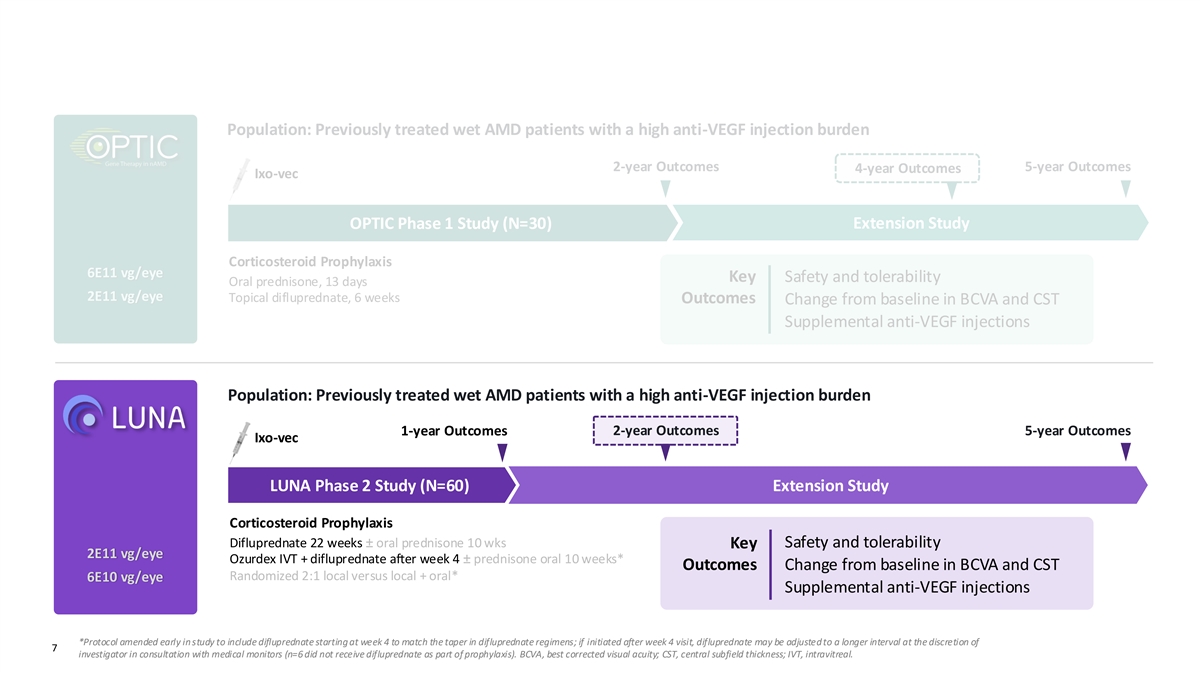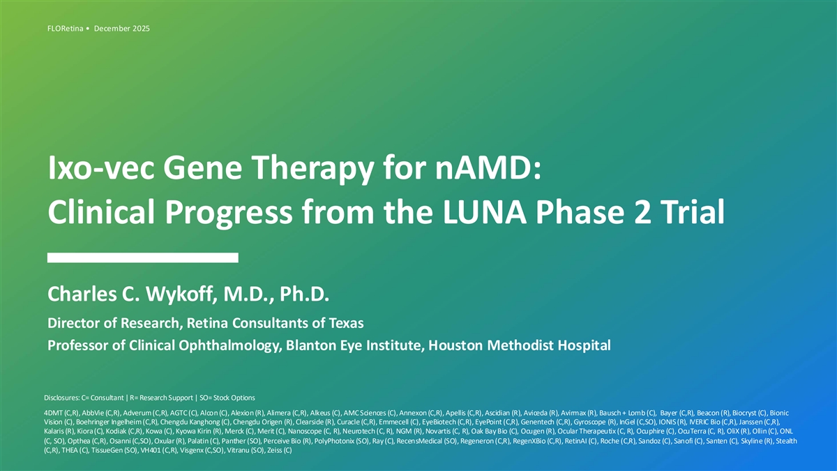 FLORetina • December 2025 Ixo-vec Gene Therapy for nAMD: Clinical Progress from the LUNA Phase 2 Trial Charles C. Wykoff, M.D., Ph.D. Director of Research, Retina Consultants of Texas Professor of Clinical Ophthalmology, Blanton Eye Institute, Houston Methodist Hospital Disclosures: C= Consultant | R= Research Support | SO= Stock Options 4DMT (C,R), AbbVie (C,R), Adverum (C,R), AGTC (C), Alcon (C), Alexion (R), Alimera (C,R), Alkeus (C), AMC Sciences (C), Annexon (C,R), Apellis (C,R), Ascidian (R), Aviceda (R), Avirmax (R), Bausch + Lomb (C), Bayer (C,R), Beacon (R), Biocryst (C), Bionic Vision (C), Boehringer Ingelheim (C,R), Chengdu Kanghong (C), Chengdu Origen (R), Clearside (R), Curacle (C,R), Emmecell (C), EyeBiotech (C,R), EyePoint (C,R), Genentech (C,R), Gyroscope (R), InGel (C,SO), IONIS (R), IVERIC Bio (C,R), Janssen (C,R), Kalaris (R), Kiora (C), Kodiak (C,R), Kowa (C), Kyowa Kirin (R), Merck (C), Merit (C), Nanoscope (C, R), Neurotech (C, R), NGM (R), Novartis (C, R), Oak Bay Bio (C), Ocugen (R), Ocular Therapeutix (C, R), Ocuphire (C), OcuTerra (C, R), OliX (R), Ollin (C), ONL (C, SO), Opthea (C,R), Osanni (C,SO), Oxular (R), Palatin (C), Panther (SO), Perceive Bio (R), PolyPhotonix (SO), Ray (C), RecensMedical (SO), Regeneron (C,R), RegenXBio (C,R), RetinAI (C), Roche (C,R), Sandoz (C), Sanofi (C), Santen (C), Skyline (R), Stealth (C,R), THEA (C), TissueGen (SO), VH401 (C,R), Visgenx (C,SO), Vitranu (SO), Zeiss (C)