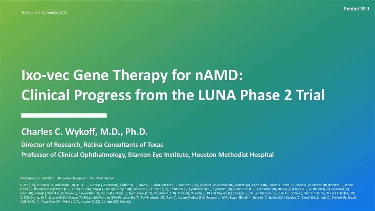 Exhibit 99.1 FLORetina • December 2025 Ixo-vec Gene Therapy for nAMD: Clinical Progress from the LUNA Phase 2 Trial Charles C. Wykoff, M.D., Ph.D. Director of Research, Retina Consultants of Texas Professor of Clinical Ophthalmology, Blanton Eye Institute, Houston Methodist Hospital Disclosures: C= Consultant | R= Research Support | SO= Stock Options 4DMT (C,R), AbbVie (C,R), Adverum (C,R), AGTC (C), Alcon (C), Alexion (R), Alimera (C,R), Alkeus (C), AMC Sciences (C), Annexon (C,R), Apellis (C,R), Ascidian (R), Aviceda (R), Avirmax (R), Bausch + Lomb (C), Bayer (C,R), Beacon (R), Biocryst (C), Bionic Vision (C), Boehringer Ingelheim (C,R), Chengdu Kanghong (C), Chengdu Origen (R), Clearside (R), Curacle (C,R), Emmecell (C), EyeBiotech (C,R), EyePoint (C,R), Genentech (C,R), Gyroscope (R), InGel (C,SO), IONIS (R), IVERIC Bio (C,R), Janssen (C,R), Kalaris (R), Kiora (C), Kodiak (C,R), Kowa (C), Kyowa Kirin (R), Merck (C), Merit (C), Nanoscope (C, R), Neurotech (C, R), NGM (R), Novartis (C, R), Oak Bay Bio (C), Ocugen (R), Ocular Therapeutix (C, R), Ocuphire (C), OcuTerra (C, R), OliX (R), Ollin (C), ONL (C, SO), Opthea (C,R), Osanni (C,SO), Oxular (R), Palatin (C), Panther (SO), Perceive Bio (R), PolyPhotonix (SO), Ray (C), RecensMedical (SO), Regeneron (C,R), RegenXBio (C,R), RetinAI (C), Roche (C,R), Sandoz (C), Sanofi (C), Santen (C), Skyline (R), Stealth (C,R), THEA (C), TissueGen (SO), VH401 (C,R), Visgenx (C,SO), Vitranu (SO), Zeiss (C)
