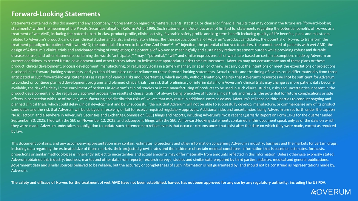 Forward-Looking Statements Statements contained in this document and any accompanying presentation regarding matters, events, statistics, or clinical or financial results that may occur in the future are “forward-looking statements” within the meaning of the Private Securities Litigation Reform Act of 1995. Such statements include, but are not limited to, statements regarding the potential benefits of Ixo-vec as a treatment of wet AMD, including the potential best-in-class product profile, clinical activity, favorable safety profile and long-term benefit including quality of life benefits; plans and milestones related to Adverum’s product candidates, clinical studies and trials, and regulatory filings; the therapeutic potential of Adverum’s product candidates; the potential of Ixo-vec to transform the TM treatment paradigm for patients with wet AMD; the potential of ixo-vec to be a One-And-Done IVT injection; the potential of ixo-vec to address the unmet need of patients with wet AMD; the design of Adverum’s clinical trials and anticipated timing of completion; the potential of Ixo-vec to meaningfully and sustainably reduce treatment burden while providing robust and durable disease control; and other statements containing the words “anticipates,” “may,” “potential,” “will” and similar expressions, all of which are based on certain assumptions made by Adverum on current conditions, expected future developments and other factors Adverum believes are appropriate under the circumstances. Adverum may not consummate any of these plans or these product, clinical development, process development, manufacturing, or regulatory goals in a timely manner, or at all, or otherwise carry out the intentions or meet the expectations or projections disclosed in its forward-looking statements, and you should not place undue reliance on these forward-looking statements. Actual results and the timing of events could differ materially from those anticipated in such forward-looking statements as a result of various risks and uncertainties, which include, without limitation, the risk that Adverum’s resources will not be sufficient for Adverum to conduct or continue planned development programs and planned clinical trials, the risk that preliminary or interim data from Adverum’s clinical trials may change as more patient data become available, the risk of a delay in the enrollment of patients in Adverum’s clinical studies or in the manufacturing of products to be used in such clinical studies, risks and uncertainties inherent in the product development and the regulatory approval process, the results of clinical trials not always being predictive of future clinical trials and results, the potential for future complications or side effects in connection with use of Ixo-vec, manufacturing and distribution risks of Ixo-vec that may result in additional costs or delays, Adverum's reliance on third parties to conduct ongoing and planned clinical trials, which could delay clinical development and be unsuccessful, the risk that Adverum will not be able to successfully develop, manufacture, or commercialize any of its product candidates and the risk that Adverum will be delayed in receiving or fail to receive required regulatory approvals. Additional risks and uncertainties facing Adverum are set forth under the caption “Risk Factors” and elsewhere in Adverum’s Securities and Exchange Commission (SEC) filings and reports, including Adverum’s most recent Quarterly Report on Form 10-Q for the quarter ended September 30, 2025, filed with the SEC on November 12, 2025, and subsequent filings with the SEC. All forward-looking statements contained in this document speak only as of the date on which they were made. Adverum undertakes no obligation to update such statements to reflect events that occur or circumstances that exist after the date on which they were made, except as required by law. This document contains, and any accompanying presentation may contain, estimates, projections and other information concerning Adverum’s industry, business and the markets for certain drugs, including data regarding the estimated size of those markets, their projected growth rates and the incidence of certain medical conditions. Information that is based on estimates, forecasts, projections or similar methodologies is inherently subject to uncertainties and actual amounts may differ materially from amounts reflected in this information. Unless otherwise expressly stated, Adverum obtained this industry, business, market and other data from reports, research surveys, studies and similar data prepared by third parties, industry, medical and general publications, government data and similar sources believed to be reliable, but the accuracy or completeness of such information is not guaranteed by, and should not be construed as representations made by, Adverum. The safety and efficacy of Ixo-vec for the treatment of wet AMD have not been established. Ixo-vec has not been approved for any use by any regulatory authority, including the US FDA.