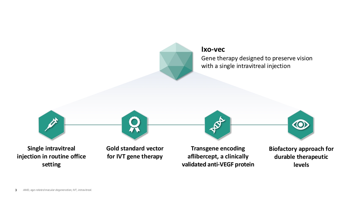 Ixo-vec: A Potentially Transformative Therapy for Wet AMD Ixo-vec Gene therapy designed to preserve vision with a single intravitreal injection Single intravitreal Gold standard vector Transgene encoding Biofactory approach for injection in routine office for IVT gene therapy aflibercept, a clinically durable therapeutic setting validated anti-VEGF protein levels 3 AMD, age-related macular degeneration; IVT, intravitreal.