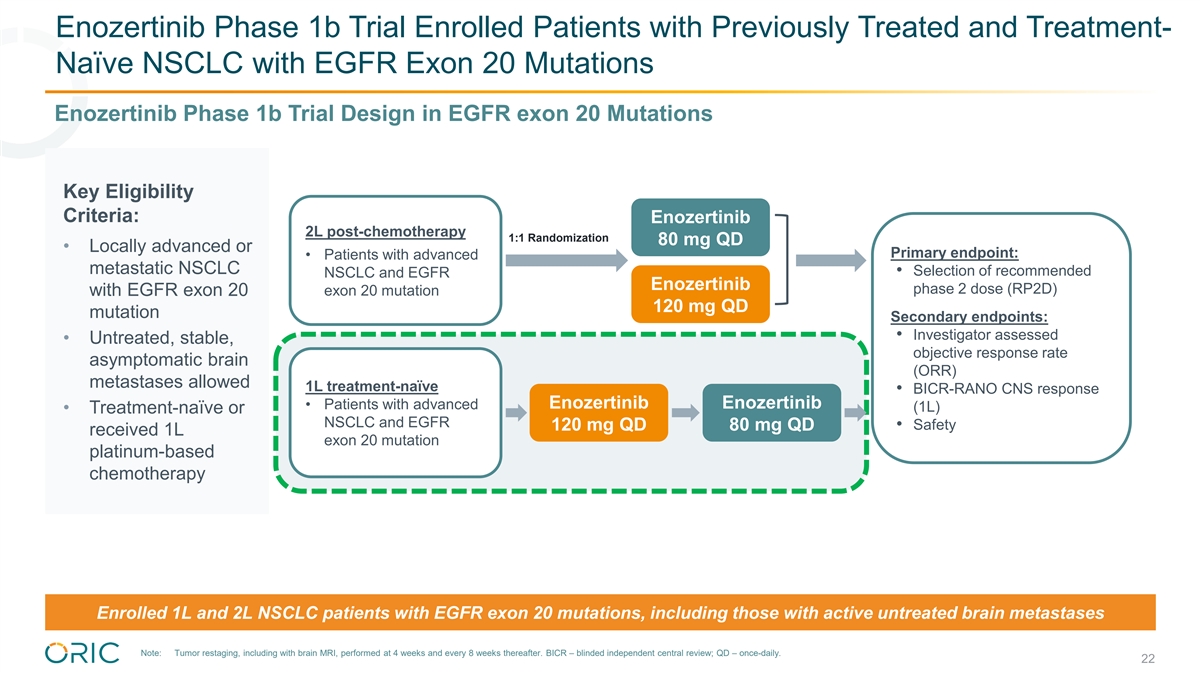Forward-Looking Statements This presentation contains forward-looking statements that involve substantial risks and uncertainties. All statements other than statements of historical facts contained in this presentation, including statements regarding ORIC Pharmaceuticals, Inc.’s (“ORIC”, “we”, “us” or “our”) future financial condition, results of operations, business strategy and plans, and objectives of management for future operations, as well as statements regarding industry trends, are forward-looking statements. In some cases, you can identify forward-looking statements by terminology such as “anticipate,” “believe,” “continue,” “could,” “estimate,” “expect,” “intend,” “may,” “plan,” “potentially,” “predict,” “should,” “will” or the negative of these terms or other similar expressions. Forward-looking statements contained in this presentation also include, but are not limited to, statements regarding: the potential best-in-class profile of enozertinib (ORIC-114), including antitumor activity that exceeds competitor benchmarks; our development plans and timelines; the potential advantages of enozertinib; plans for the clinical trials and development of enozertinib and ORIC-944; enozertinib clinical outcomes, which may materially change as patient enrollment continues or more patient data becomes available; the expected timing of reporting data from our clinical trials; our anticipated milestones and clinical updates; and the period over which we estimate our existing cash and investments will be sufficient to fund our current operating plan. We have based these forward-looking statements largely on our current expectations and projections about future events and trends that we believe may affect our financial condition, results of operations, business strategy and financial needs. These forward-looking statements are subject to a number of risks, uncertainties and assumptions, including, among other things: the timing of the initiation, progress and results of our preclinical studies and clinical trials; risks associated with the process of developing and commercializing drugs that are safe and effective for use in humans and operating as an early clinical stage company; negative impacts of health emergencies, economic instability or international conflicts on our operations, including clinical trials; the potential for current or future clinical trials of product candidates to differ from preclinical, initial, interim, preliminary or expected results; our ability to advance product candidates into, and successfully complete, clinical trials; the timing or likelihood of regulatory filings and approvals; changes in our plans to develop and commercialize our product candidates; our estimates of the number of patients who suffer from the diseases we are targeting and the number of patients that may enroll in our clinical trials; the commercializing of our product candidates, if approved; our ability to successfully manufacture and supply our product candidates for clinical trials and for commercial use, if approved; potential benefits and costs of strategic arrangements, licensing and/or collaborations; the risk of the occurrence of any event, change or other circumstance that could give rise to the termination of our license or collaboration agreements; our estimates regarding expenses, future revenue, capital requirements and needs for financing and our ability to obtain capital; the sufficiency of our existing cash and investments to fund our future operating expenses and capital expenditure requirements; our ability to retain the continued service of our key personnel and to identify, hire and retain additional qualified professionals; the implementation of our business model and strategic plans for our business and product candidates; the scope of protection we are able to establish and maintain for intellectual property rights, product candidates and our pipeline; our ability to contract with third-party contract research organizations, suppliers and manufacturers and their ability to perform adequately; the pricing, coverage and reimbursement of our product candidates, if approved; developments relating to our competitors and our industry, including competing product candidates and therapies; regulatory developments in the United States and foreign countries; general economic and market conditions; and the other risks, uncertainties and assumptions discussed in the public filings we have made and will make with the Securities and Exchange Commission (“SEC”). These risks are not exhaustive. New risk factors emerge from time to time and it is not possible for our management to predict all risk factors, nor can we assess the impact of all factors on our business or the extent to which any factor, or combination of factors, may cause actual results to differ materially from those contained in, or implied by, any forward-looking statements. You should not rely upon forward-looking statements as predictions of future events. Although we believe that the expectations reflected in the forward-looking statements are reasonable, we cannot guarantee future results, levels of activity, performance or achievements. This presentation also contains estimates and other statistical data made by independent parties and by us relating to market size and other data about our industry. This data involves a number of assumptions and limitations, and you are cautioned not to give undue weight to such data and estimates. In addition, projections, assumptions and estimates of our future performance and the future performance of the markets in which we operate are necessarily subject to a high degree of uncertainty and risk. Except as required by law, we undertake no obligation to update any statements in this presentation for any reason after the date of this presentation. We have filed Current Reports on Form 8-K, Quarterly Report