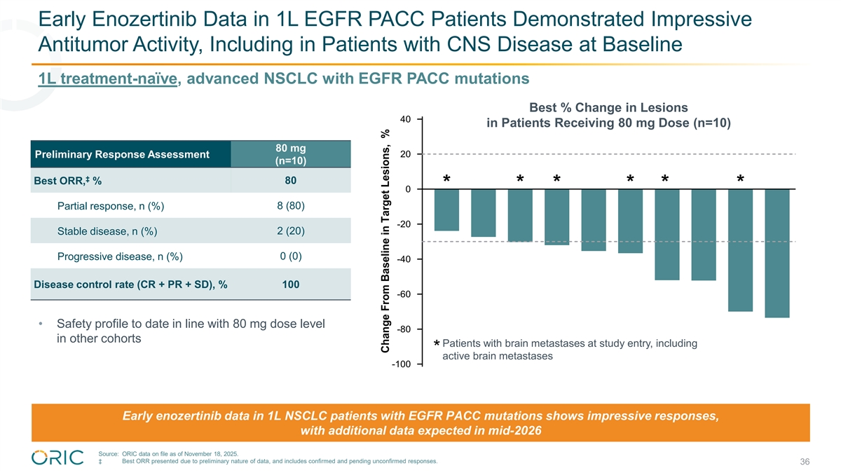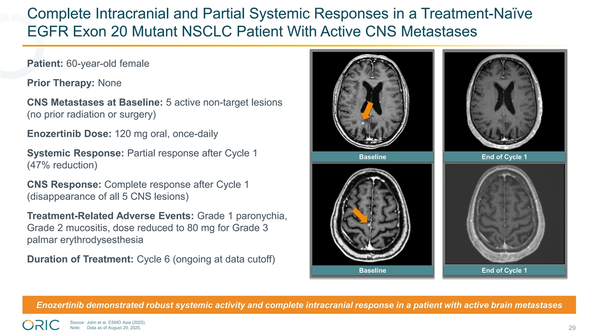 Partial Intracranial and Systemic Responses in a Treatment-Naïve EGFR PACC Mutant NSCLC Patient with Active CNS Disease Patient: 67-year-old male PACC Mutation: G719A Prior Therapy: None CNS Metastases at Baseline: 1 target lesion Baseline BOR Timepoint (no prior radiation or surgery) Enozertinib Dose: 80 mg oral, once-daily Systemic Response: Partial response after Cycle 1 (43% reduction) CNS Response: Partial response after Cycle 1 (66% reduction); complete response after Cycle 4 Baseline BOR Timepoint Treatment-Related Adverse Events: Grade 1 acneiform rash Duration of Treatment: Cycle 5 (ongoing at data cutoff) Enozertinib demonstrated robust systemic activity and complete intracranial response in a patient with active brain metastasis Source: ORIC data on file as of November 18, 2025. 38