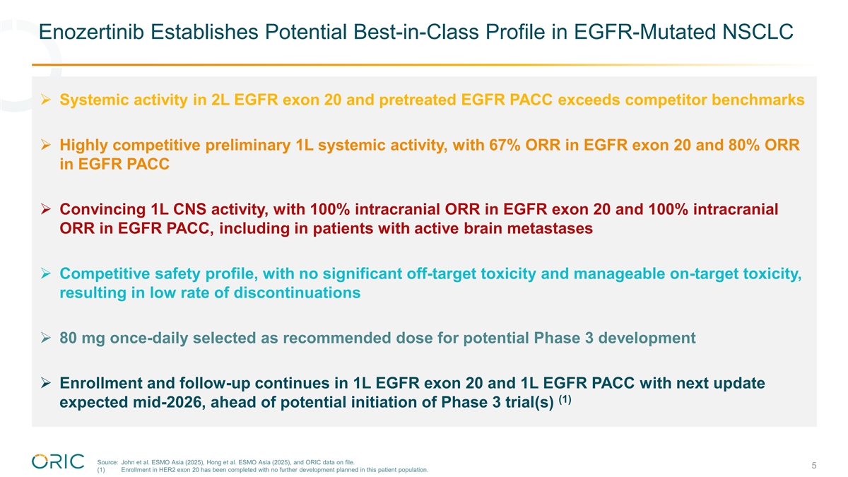 Enozertinib Phase 1b Data Establishes Potential Best-in-Class Profile in EGFR Exon 20 and PACC Mutated NSCLC Enozertinib Updated Phase 1b Data Highlights 2L EGFR Exon 20 Median 3L EGFR PACC 45% 36% ORR ORR Enozertinib Enozertinib Previously Treated 22% 40% Benchmark ORR Benchmark ORR 1L EGFR Exon 20 (Preliminary Data) 1L EGFR PACC (Preliminary Data) 80% ORR 67% ORR Enozertinib Enozertinib Treatment- Naïve (1L) Intracranial ORR Enozertinib 100% Intracranial ORR Enozertinib 100% Enozertinib data in previously treated patients with EGFR exon 20 and PACC mutations exceed competitor benchmarks; preliminary 1L systemic and intracranial activity establishes potential best-in-class profile Source: John et al. ESMO Asia (2025), Hong et al. ESMO Asia (2025), and ORIC data on file. Benchmark ORR: Piotrowska et al. J Clin Oncol (2025) and Udagawa et al. WCLC (2025). Note: All data in previously treated patients represent confirmed ORR. All data in 1L patients represent best ORR, due to preliminary nature of data. 1L EGFR exon 20 intracranial ORR data in all patients with measurable CNS disease by BICR-RANO 40 and 1L EGFR PACC intracranial ORR data in all patients with measurable CNS disease by investigator assessment using RECIST.