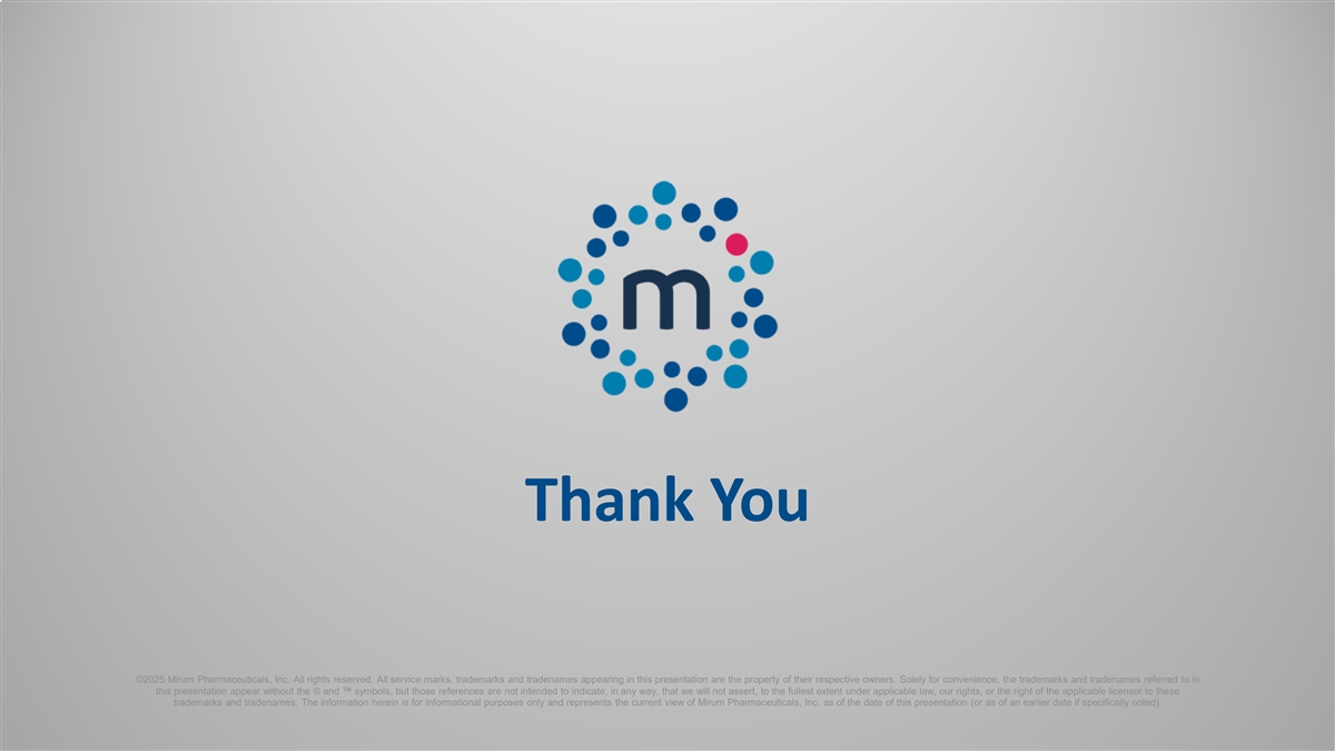 Thank You ©2025 Mirum Pharmaceuticals, Inc. All rights reserved. All service marks, trademarks and tradenames appearing in this presentation are the property of their respective owners. Solely for convenience, the trademarks and tradenames referred to in this presentation appear without the ® and symbols, but those references are not intended to indicate, in any way, that we will not assert, to the fullest extent under applicable law, our rights, or the right of the applicable licensor to these trademarks and tradenames. The information herein is for informational purposes only and represents the current view of Mirum Pharmaceuticals, Inc. as of the date of this presentation (or as of an earlier date if specifically noted).