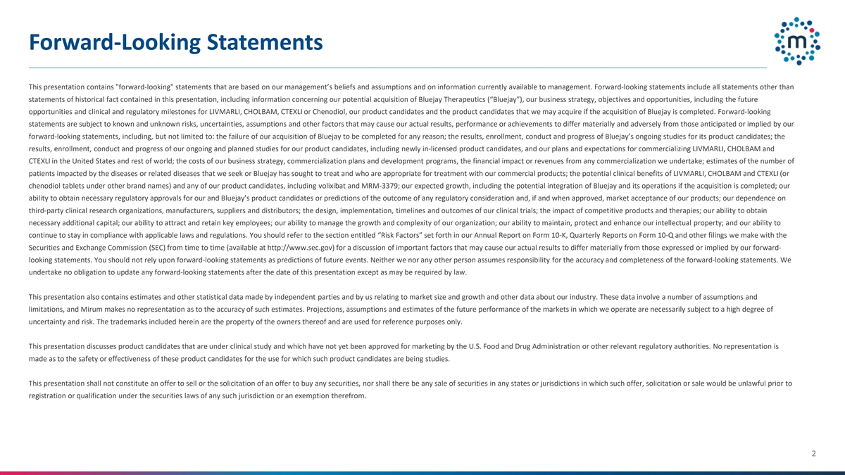 Forward-Looking Statements This presentation contains forward-looking statements that are based on our management’s beliefs and assumptions and on information currently available to management. Forward-looking statements include all statements other than statements of historical fact contained in this presentation, including information concerning our potential acquisition of Bluejay Therapeutics (“Bluejay”), our business strategy, objectives and opportunities, including the future opportunities and clinical and regulatory milestones for LIVMARLI, CHOLBAM, CTEXLI or Chenodiol, our product candidates and the product candidates that we may acquire if the acquisition of Bluejay is completed. Forward-looking statements are subject to known and unknown risks, uncertainties, assumptions and other factors that may cause our actual results, performance or achievements to differ materially and adversely from those anticipated or implied by our forward-looking statements, including, but not limited to: the failure of our acquisition of Bluejay to be completed for any reason; the results, enrollment, conduct and progress of Bluejay’s ongoing studies for its product candidates; the results, enrollment, conduct and progress of our ongoing and planned studies for our product candidates, including newly in-licensed product candidates, and our plans and expectations for commercializing LIVMARLI, CHOLBAM and CTEXLI in the United States and rest of world; the costs of our business strategy, commercialization plans and development programs, the financial impact or revenues from any commercialization we undertake; estimates of the number of patients impacted by the diseases or related diseases that we seek or Bluejay has sought to treat and who are appropriate for treatment with our commercial products; the potential clinical benefits of LIVMARLI, CHOLBAM and CTEXLI (or chenodiol tablets under other brand names) and any of our product candidates, including volixibat and MRM-3379; our expected growth, including the potential integration of Bluejay and its operations if the acquisition is completed; our ability to obtain necessary regulatory approvals for our and Bluejay’s product candidates or predictions of the outcome of any regulatory consideration and, if and when approved, market acceptance of our products; our dependence on third-party clinical research organizations, manufacturers, suppliers and distributors; the design, implementation, timelines and outcomes of our clinical trials; the impact of competitive products and therapies; our ability to obtain necessary additional capital; our ability to attract and retain key employees; our ability to manage the growth and complexity of our organization; our ability to maintain, protect and enhance our intellectual property; and our ability to continue to stay in compliance with applicable laws and regulations. You should refer to the section entitled “Risk Factors” set forth in our Annual Report on Form 10-K, Quarterly Reports on Form 10-Q and other filings we make with the Securities and Exchange Commission (SEC) from time to time (available at http://www.sec.gov) for a discussion of important factors that may cause our actual results to differ materially from those expressed or implied by our forward- looking statements. You should not rely upon forward-looking statements as predictions of future events. Neither we nor any other person assumes responsibility for the accuracy and completeness of the forward-looking statements. We undertake no obligation to update any forward-looking statements after the date of this presentation except as may be required by law. This presentation also contains estimates and other statistical data made by independent parties and by us relating to market size and growth and other data about our industry. These data involve a number of assumptions and limitations, and Mirum makes no representation as to the accuracy of such estimates. Projections, assumptions and estimates of the future performance of the markets in which we operate are necessarily subject to a high degree of uncertainty and risk. The trademarks included herein are the property of the owners thereof and are used for reference purposes only. This presentation discusses product candidates that are under clinical study and which have not yet been approved for marketing by the U.S. Food and Drug Administration or other relevant regulatory authorities. No representation is made as to the safety or effectiveness of these product candidates for the use for which such product candidates are being studies. This presentation shall not constitute an offer to sell or the solicitation of an offer to buy any securities, nor shall there be any sale of securities in any states or jurisdictions in which such offer, solicitation or sale would be unlawful prior to registration or qualification under the securities laws of any such jurisdiction or an exemption therefrom. 2