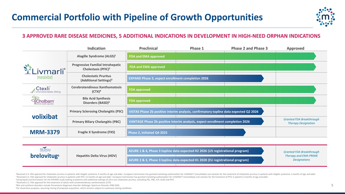 Commercial Portfolio with Pipeline of Growth Opportunities 3 APPROVED RARE DISEASE MEDICINES, 5 ADDITIONAL INDICATIONS IN DEVELOPMENT IN HIGH-NEED ORPHAN INDICATIONS Indication Preclinical Phase 1 Phase 2 and Phase 3 Approved 1 Alagille Syndrome (ALGS) FDA and EMA approved Progressive Familial Intrahepatic FDA and EMA approved 2 Cholestasis (PFIC) Cholestatic Pruritus EXPAND Phase 3, expect enrollment completion 2026 3 (Additional Settings) ® Cerebrotendinous Xanthomatosis FDA approved 4 (CTX) Bile Acid Synthesis FDA approved 5 Disorders (BASD) Primary Sclerosing Cholangitis (PSC) VISTAS Phase 2b positive interim analysis, confirmatory topline data expected Q2 2026 volixibat Granted FDA Breakthrough Primary Biliary Cholangitis (PBC) VANTAGE Phase 2b positive interim analysis, expect enrollment completion 2026 Therapy Designation Fragile X Syndrome (FXS) Phase 2, initiated Q4 2025 MRM-3379 AZURE 1 & 4, Phase 3 topline data expected H2 2026 (US registrational program) Granted FDA Breakthrough 6 Hepatitis Delta Virus (HDV) Therapy and EMA PRIME brelovitug Designations AZURE 2 & 3, Phase 3 topline data expected H1 2028 (EU registrational program) 1 Received U.S. FDA approval for cholestatic pruritus in patients with Alagille syndrome 3 months of age and older. European Commission has granted marketing authorization for LIVMARLI® (maralixibat) oral solution for the treatment of cholestatic pruritus in patients with Alagille syndrome 2 months of age and older 2 Received U.S. FDA approval for cholestatic pruritus in patients with PFIC 12 months of age and older. European Commission has granted marketing authorization for LIVMARLI® (maralixibat) oral solution for the treatment of PFIC in patients 3 months of age and older 3 Using liquid oral formulation for the EXPAND study looking at patients with additional settings of ultra rare cholestatic pruritus, excluding PSC, PBC, ICP, ALGS and PFIC 4 Received U.S. FDA approval for the treatment of adults with cerebrotendinous xanthomatosis (CTX) 5 Bile acid synthesis disorders include Peroxisome biogenesis disorder-Zellweger Spectrum Disorder (PBD-ZSD) 5 6 For illustrative purposes, assuming closing of proposed acquisition, which remains subject to customary closing conditions