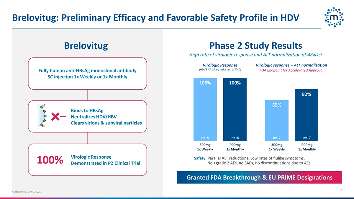 Brelovitug is an investigational, highly potent, pan-genotypic, fully human immunoglobulin G1 (IgG1) monoclonal antibody (mAb) that targets the surface antigen (anti-HBsAg) on both the chronic hepatitis D virus (HDV) and the hepatitis B virus (HBV). Brelovitug is designed to neutralize and remove hepatitis B and hepatitis D virions and deplete HBsAg-containing subviral particles. Brelovitug has FDA Breakthrough Therapy designation for the treatment of HDV and PRIME and Orphan designations from the European Medicines Agency. Following the anticipated close of the Bluejay acquisition, Mirum Pharmaceuticals, Inc. will own worldwide rights to brelovitug.