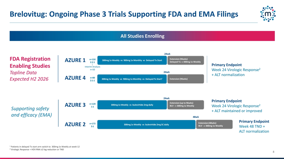 Brelovitug is being evaluated in the AZURE Phase 3 global, registrational program for HDV, which program includes four open-label studies designed to assess the primary endpoint of combined virologic and biochemical response: AZURE 1 and AZURE 4, which are intended to enable a regulatory filing with the FDA, and AZURE 2 and AZURE 3, which are intended to support a regulatory filing with the EMA. The AZURE Phase 3 studies build on the Phase 2 studies where brelovitug demonstrated strong antiviral activity in HDV, achieving 100% HDV ribonucleic acid response along with improvements in alanine aminotransferase enzyme levels and a favorable safety profile, with the most common adverse event being injection-site erythema. The ongoing global AZURE Phase 3 program is currently enrolling patients, with an interim analysis of AZURE 1 expected in the second quarter of 2026, top-line data from AZURE 1 and AZURE 4 expected in the second half of 2026 and top-line data from AZURE 2 and AZURE 3 expected by the first half of 2028. The Company believes that these results may support a potential biologics license application submission to the FDA for brelovitug in HDV in the first half of 2027 followed by a potential approval and launch, if approved, in the second half of 2027.
