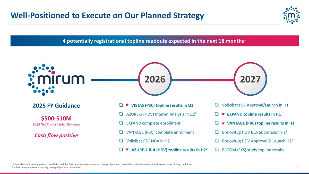 Brelovitug: Ongoing Phase 3 Trials Supporting FDA and EMA Filings All Studies Enrolling 24wk Extension (96wks) n=150 FDA Registration 300mg 1x Weekly vs 900mg 1x Monthly vs Delayed Tx Start AZURE 1 Delayed Tx→ 300mg 1x Weekly 2:2:1 Primary Endpoint Interim Analysis Enabling Studies 2 n=50 Week 24 Virologic Response 24wk Topline Data + ALT normalization n=80 1 AZURE 4 300mg 1x Weekly vs 900mg 1x Monthly vs Delayed Tx Start Extension (96wks) Expected H2 2026 2:1:1 24wk Primary Endpoint Extension (up to 96wks) n=120 300mg 1x Weekly vs bulevirtide 2mg daily 2 BLV → 300mg 1x Weekly AZURE 3 Week 24 Virologic Response 1:1 Supporting safety + ALT maintained or improved and efficacy (EMA) 48wk Primary Endpoint Extension (48wks) n=172 300mg 1x Weekly vs bulevirtide 2mg SC daily AZURE 2 BLV → 300mg 1x Weekly 3:1 Week 48 TND + ALT normalization 1 Patients in delayed Tx start arm switch to 300mg 1x Weekly at week 12 2 Virologic Response = HDV RNA ≥2 log reduction or TND 8