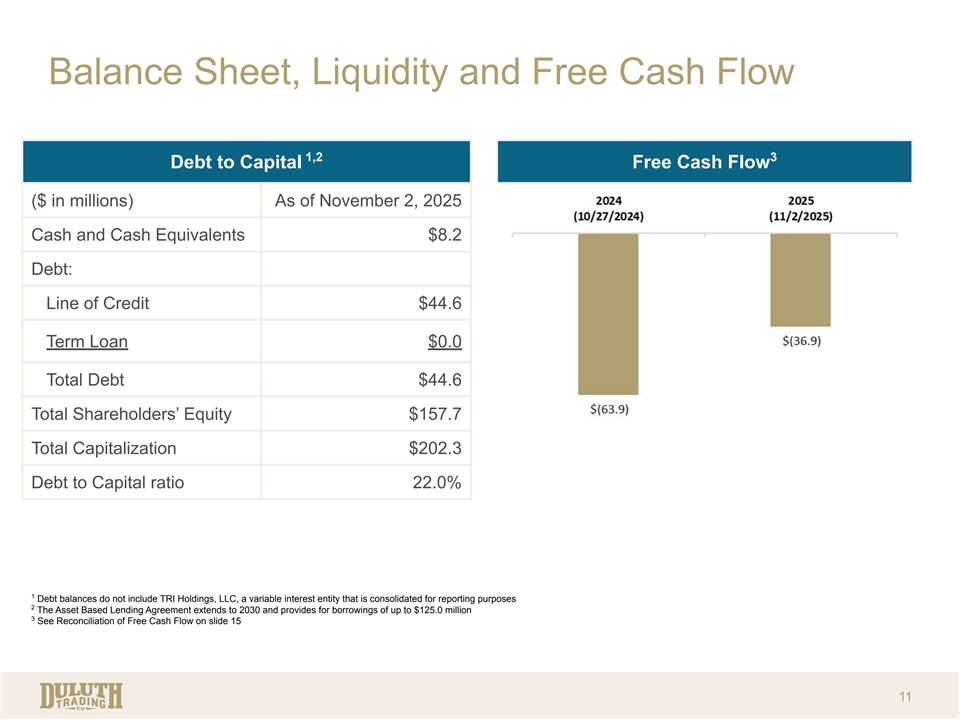 Certain matters discussed in this Current Report on Form 8-K and other oral and written statements by representatives of the Company including, but not limited to, the Company’s ability to meet its fiscal 2025 expectations (including its ability to achieve its projected net sales and adjusted EBITDA) and its ability to execute on its growth strategies and its long-term growth targets, are forward-looking statements within the meaning of the Private Securities Litigation Reform Act of 1995. You can identify forward-looking statements by the use of words such as “may,” “might,” “will,” “should,” “expect,” “plan,” “anticipate,” “could,” “believe,” “estimate,” “project,” “target,” “predict,” “intend,” “future,” “budget,” “goals,” “potential,” “continue,” “design,” “objective,” “forecasted,” “would,” and other similar expressions. The forward-looking statements are not historical facts, and are based upon Duluth Trading’s current expectations, beliefs, estimates, and projections, and various assumptions, many of which, by their nature, are inherently uncertain and beyond Duluth Trading’s control. Duluth Trading’s expectations, beliefs and projections are expressed in good faith, and Duluth Trading believes there is a reasonable basis for them. However, there can be no assurance that management’s expectations, beliefs, estimates, and projections will be achieved and actual results may vary materially from what is expressed in or indicated by the forward-looking statements. Forward-looking statements are subject to risks and uncertainties that could cause actual performance or results to differ materially from those expressed in the forward-looking statements, including, among others, the risks, uncertainties, and factors set forth under Part 1, Item 1A “Risk Factors” in the Company’s Annual Report on Form 10-K filed with the SEC on March 24, 2025 and other factors as may be periodically described in Duluth Trading’s subsequent filings with the SEC. These risks and uncertainties include, but are not limited to, the following: the impact of inflation and measures to control inflation on our results of operations; the prolonged effects of economic uncertainties on store and website traffic; the susceptibility of the price and availability of our merchandise to international trade conditions including tariffs; changes in U.S. and non-U.S. laws affecting the importation and taxation of goods, including imposition of unilateral tariffs on imported goods; our ability to secure the personal and/or financial information of our customers and employees; disruptions to our distribution network, supply chains and operations; failure to effectively manage inventory levels; our ability to maintain and enhance a strong brand and sub-brand image; adapting to declines in consumer confidence, inflation and decreases in consumer spending; disruptions to our e-commerce platform; our ability to meet customer delivery time expectations; our ability to properly allocate inventory throughout our distribution network to fulfill customer demand; our failure to meet our debt covenant ratios; natural disasters, unusually adverse weather conditions, boycotts, prolonged public health crises, epidemics or pandemics and unanticipated events; generating adequate cash from our existing stores and direct sales to support our growth; the impact of changes in corporate tax regulations and sales tax; identifying and responding to new and changing customer preferences; the success of the locations in which our stores are located; effectively relying on sources for merchandise located in foreign markets; transportation delays and interruptions, including port congestion; our inability to timely and effectively obtain shipments of products from our suppliers and deliver merchandise to our customers; the inability to maintain the performance of our maturing store portfolio; our inability to deploy marketing tactics to strengthen brand awareness and attract new customers in a cost effective manner; our ability to successfully open new stores; effectively adapting to new challenges associated with our expansion into new geographic markets; competing effectively in an environment of intense competition or elevated promotions; our ability to adapt to significant changes in sales due to the seasonality of our business; price reductions or inventory shortages resulting from failure to purchase the appropriate amount of inventory in advance of the season in which it will be sold; the potential for further increases in price and lack of availability of raw materials; our dependence on third-party vendors to provide us with sufficient quantities of merchandise at acceptable prices; failure of our vendors and their manufacturing sources to use acceptable labor or other practices; our dependence upon key executive management or our inability to hire or retain the talent required for our business; increases in costs of fuel or other energy, transportation or utility costs and in the costs of labor and employment; failure of our information technology systems to support our current and growing business, before and after our planned upgrades; disruptions in our supply chain and fulfillment centers; our inability to protect our trademarks or other intellectual property rights; infringement on the intellectual property of third parties; acts of war, terrorism or civil unrest; the impact of governmental laws and regulations and the outcomes of legal proceedings; failure to comply with data privacy The following exhibits are being furnished with this Current Report on Form 8-K.