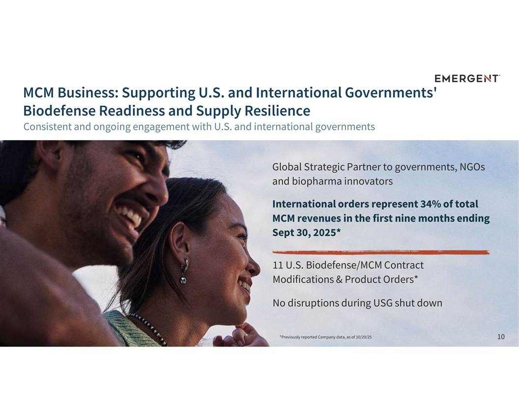 MCM Business: Supporting U.S. and International Governments' Biodefense Readiness and Supply Resilience Consistent and ongoing engagement with U.S. and international governments Global Strategic Partner to governments, NGOs and biopharma innovators International orders represent 34% of total MCM revenues in the first nine months ending Sept 30, 2025* 11 U.S. Biodefense/MCM Contract Modifications & Product Orders* No disruptions during USG shut down *Previously reported Company data, as of 10/29/25 10