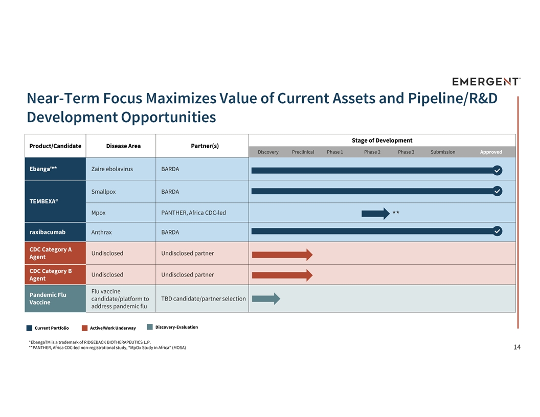 Multiple Growth Opportunities Ahead We plan to Strong cash & invest to enable liquidity position sustainable, long-term enables additional growth. internal programs Expanding U.S. and external & international Exploring potential for business MCM orders and government-funded development opportunities In 2025, Obtained R&D development opportunities (ongoing) KLOXXADO® Nasal programs. (ongoing) Spray U.S. and Canada exclusive In 2025, completed Selectively evaluating commercial rights; Rocketvax strategically suitable additional line investment & external programs. extensions for pursuit of strategic naloxone business relationship 13