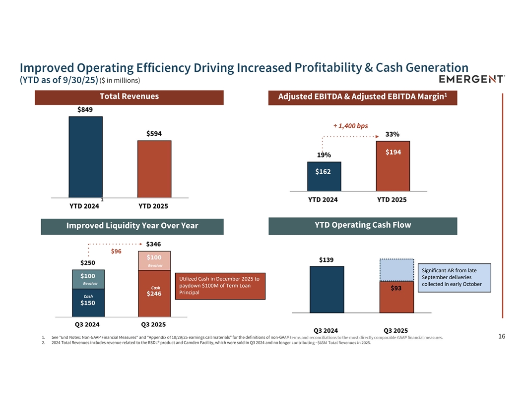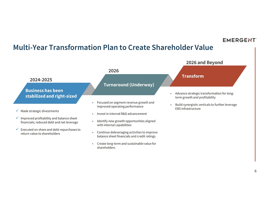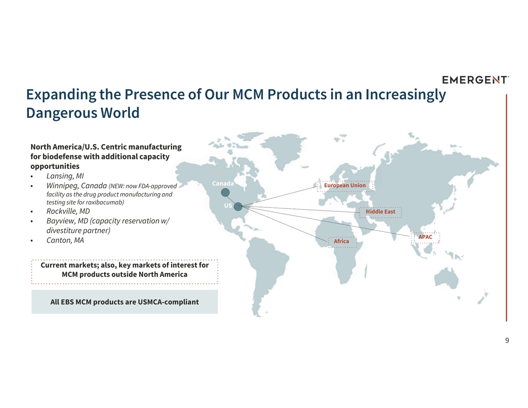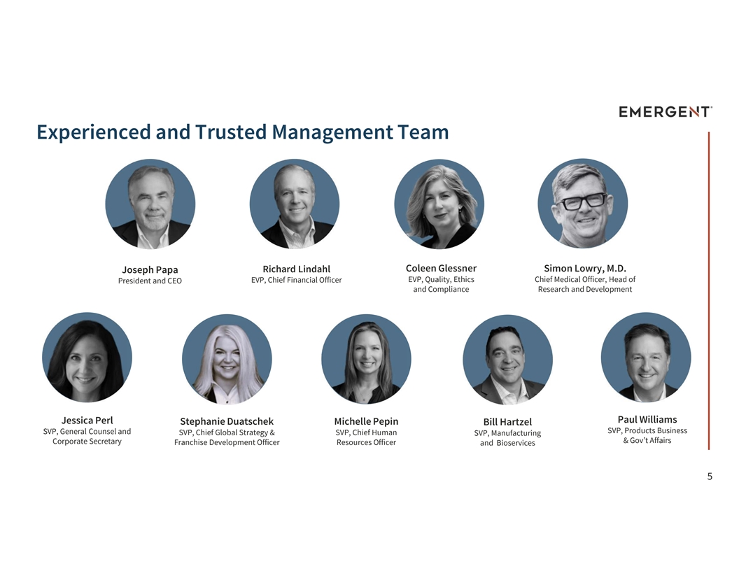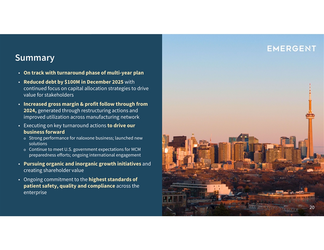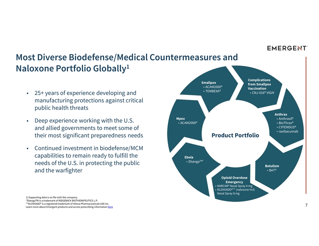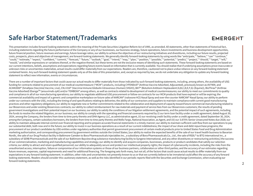 Safe Harbor Statement/Trademarks This presentation includes forward-looking statements within the meaning of the Private Securities Litigation Reform Act of 1995, as amended. All statements, other than statements of historical fact, including statements regarding the future performance of the Company or any of our businesses, our business strategy, future operations, future investments and business development opportunities, future financial position, future revenues and earnings, future leverage ratios, our ability to achieve the objectives of our restructuring initiatives and divestitures, including our future results, projected costs, prospects, plans and objectives of management, are forward-looking statements. We generally identify forward-looking statements by using words like “anticipate,” “believe,” “can” “continue,” “could,” “estimate,” “expect,” “confident,” “commit,” “forecast,” “future,” “outlook,” “goal,” “intend,” “may,” “plan,” “position,” “possible,” “potential,” “predict,” “project,” “should,” “target,” “will,” “would,” and similar expressions or variations thereof, or the negative thereof, but these terms are not the exclusive means of identifying such statements. These forward-looking statements are based on our current intentions, beliefs, assumptions and expectations regarding future events based on information that is currently available. You should realize that if underlying assumptions prove inaccurate or unknown risks or uncertainties materialize, actual results could differ materially from our expectations. Readers are, therefore, cautioned not to place undue reliance on any forward-looking statement contained herein. Any such forward-looking statement speaks only as of the date of this presentation, and, except as required by law, we do not undertake any obligation to update any forward-looking statement to reflect new information, events or circumstances. There are a number of important factors that could cause our actual results to differ materially from those indicated by such forward-looking statements, including, among others, the availability of USG funding for contracts related to procurement of our medical countermeasure (“MCM”) products, including CYFENDUS® (Anthrax Vaccine Adsorbed, Adjuvanted), previously known as AV7909, and ACAM2000® (Smallpox (Vaccinia) Vaccine, Live), CNJ-016® (Vaccinia Immune Globulin Intravenous (Human) (VIGIV)), BAT® (Botulism Antitoxin Heptavalent (A,B,C,D,E,F,G)-(Equine)), BioThrax® (Anthrax TM Vaccine Adsorbed) Ebanga (ansuvimab-zykl) and/or TEMBEXA® among others, as well as contracts related to development of medical countermeasures; our ability to meet our commitments to quality and compliance in all of our manufacturing operations; our ability to negotiate additional USG procurement or follow-on contracts for our MCM products that have expired or will be expiring; the commercial availability and impact of a generic and competitive marketplace on future sales of NARCAN® (naloxone HCl) Nasal Spray and over-the-counter NARCAN® Nasal Spray; our ability to perform under our contracts with the USG, including the timing of and specifications relating to deliveries; the ability of our contractors and suppliers to maintain compliance with current good manufacturing practices and other regulatory obligations; our ability to negotiate new or further commitments related to the collaboration and deployment of capacity toward future commercial manufacturing related to our Bioservices and under existing Bioservices contracts; our ability to collect reimbursement for raw materials and payment of service fees from our Bioservices customers; the results of pending government investigations and their potential impact on our business; our ability to satisfy the conditions of our litigation settlement agreements, and the potential impact of such agreements, including the funds to resolve the related litigation, on our business; our ability to comply with the operating and financial covenants required by (i) our term loan facility under a credit agreement, dated August 30, 2024, among the Company, the lenders from time to time party thereto and OHA Agency LLC, as administrative agent, (ii) our revolving credit facility under a credit agreement, dated September 30, 2024, among the Company, certain subsidiary borrowers, the lenders from time to time party thereto and Wells Fargo, National Association, as Agent, and (iii) our 3.875% Senior Unsecured Notes due 2028; our ability to maintain adequate internal control over financial reporting and to prepare accurate financial statements in a timely manner; our ability to maintain sufficient cash flow from our operations to pay our substantial debt, both now and in the future; our ability to invest in our business operations as a result of our current indebtedness; the impact of our share and debt repurchase programs; the procurement of our product candidates by USG entities under regulatory authorities that permit government procurement of certain medical products prior to United States Food and Drug Administration marketing authorization, and corresponding procurement by government entities outside the United States; [our ability to realize the expected benefits of the sale of our travel health business to Bavarian Nordic, the sale of our Drug Product facility in Baltimore-Camden to Bora Pharmaceuticals Injectables Inc., a subsidiary of Bora Pharmaceuticals Co., Ltd., the sale of RSDL® to BTG International Inc., a subsidiary of SERB Pharmaceuticals and the sale of our Baltimore-Bayview drug substance manufacturing facility to Syngene International, and any other divestitures or restructuring activities;] the success of our commercialization, marketing and manufacturing capabilities and strategy; our ability to identify and acquire companies, businesses, products or product candidates tha