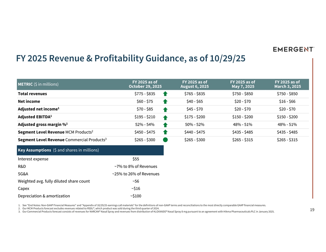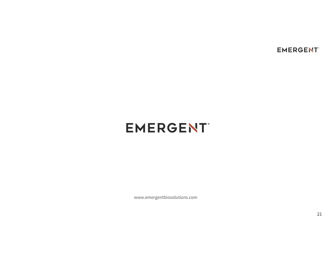 FY 2025 Revenue & Profitability Guidance, as of 10/29/25 FY 2025 as of FY 2025 as of FY 2025 as of FY 2025 as of METRIC ($ in millions) October 29, 2025 August 6, 2025 May 7, 2025 March 3, 2025 Total revenues $775 - $835 $765 - $835 $750 - $850 $750 - $850 Net income $60 - $75 $40 - $65 $20 - $70 $16 - $66 1 Adjusted net income $70 - $85 $45 - $70 $20 - $70 $20 - $70 1 Adjusted EBITDA $195 - $210 $175 - $200 $150 - $200 $150 - $200 1 Adjusted gross margin % 52% - 54% 50% - 52% 48% - 51% 48% - 51% 2 Segment Level Revenue MCM Products $450 - $475 $440 - $475 $435 - $485 $435 - $485 3 Segment Level Revenue Commercial Products $265 - $300 $265 - $300 $265 - $315 $265 - $315 Key Assumptions ($ and shares in millions) Interest expense $55 R&D ~7% to 8% of Revenues SG&A ~25% to 26% of Revenues Weighted avg. fully diluted share count ~56 Capex ~$16 Depreciation & amortization ~$100 1. See End Notes: Non-GAAP Financial Measures and Appendix of 10/29/25 earnings call materials for the definitions of non-GAAP terms and reconciliations to the most directly comparable GAAP financial measures. 2. Our MCM Products forecast excludes revenues related to RSDL®, which product was sold during the third quarter of 2024. 19 3. Our Commercial Products forecast consists of revenues for NARCAN® Nasal Spray and revenues from distribution of KLOXXADO® Nasal Spray 8 mg pursuant to an agreement with Hikma Pharmaceuticals PLC in January 2025.