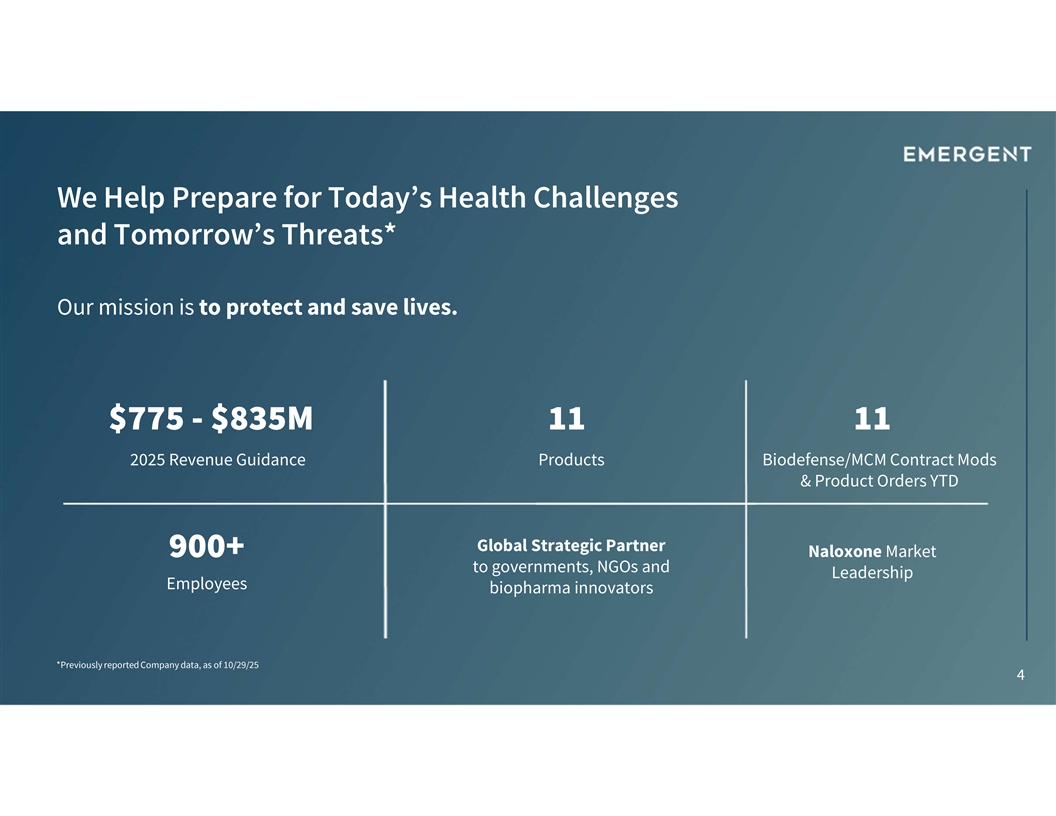 We Help Prepare for Today’s Health Challenges and Tomorrow’s Threats* Our mission is to protect and save lives. $775 - $835M 11 11 2025 Revenue Guidance Products Biodefense/MCM Contract Mods & Product Orders YTD Global Strategic Partner 900+ Naloxone Market to governments, NGOs and Leadership Employees biopharma innovators *Previously reported Company data, as of 10/29/25 4