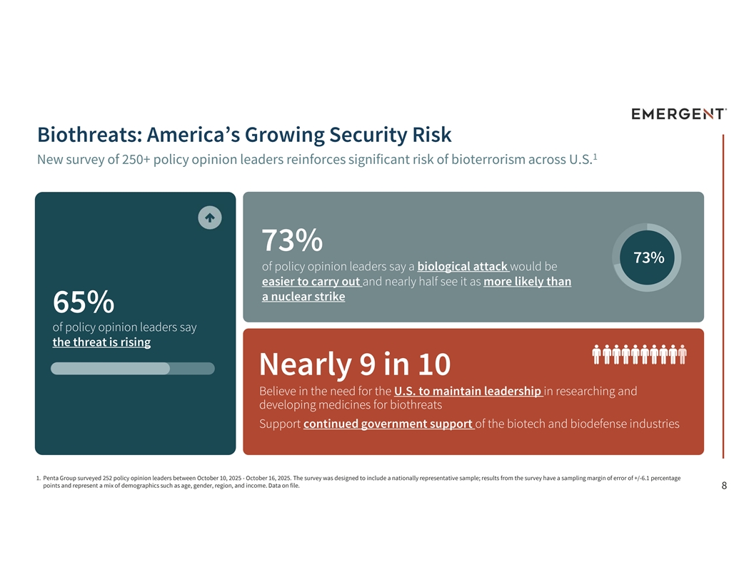 Biothreats: America’s Growing Security Risk 1 New survey of 250+ policy opinion leaders reinforces significant risk of bioterrorism across U.S. 73% 73% of policy opinion leaders say a biological attack would be easier to carry out and nearly half see it as more likely than a nuclear strike 65% of policy opinion leaders say the threat is rising Nearly 9 in 10 Believe in the need for the U.S. to maintain leadership in researching and developing medicines for biothreats Support continued government support of the biotech and biodefense industries 1. Penta Group surveyed 252 policy opinion leaders between October 10, 2025 - October 16, 2025. The survey was designed to include a nationally representative sample; results from the survey have a sampling margin of error of +/-6.1 percentage points and represent a mix of demographics such as age, gender, region, and income. Data on file. 8