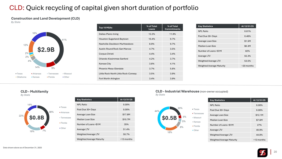 CLD: Quick recycling of capital given short duration of portfolio Construction and Land Development (CLD) By State % of Total % of Total Key Statistics At 12/31/25 Top 10 MSAs Loans Commitments NPL Ratio 0.61% 16% Dallas-Plano-Irving 12.2% 11.9% Past Due 30+ Days 0.46% Houston-Sugarland-Baytown 10.4% 9.7% 41% Average Loan Size $1.5M Nashville-Davidson-Murfreesboro 8.9% 9.7% 12% Median Loan Size $0.3M Austin-Round Rock-San Marcos 4.7% 3.5% $2.9B Number of Loans <$1M 82% 2% Corpus Christi 4.4% 3.4% Average LTV 55.3% 2% Orlando-Kissimmee-Sanford 4.2% 3.7% 4% Weighted Average LTV 53.5% Kansas City 3.8% 4.1% Weighted Average Maturity ~20 months 14% 9% Phoenix-Mesa-Glendale 3.7% 5.6% Texas Arkansas Tennessee Missouri Little Rock-North Little Rock-Conway 3.5% 3.9% Oklahoma Kansas Florida Other Fort Worth-Arlington 3.4% 3.9% CLD - Industrial Warehouse (non-owner occupied) CLD - Multifamily By State By State Key Statistics At 12/31/25 Key Statistics At 12/31/25 NPL Ratio 0.00% 14% NPL Ratio 0.00% Texas 20% Texas Past Due 30+ Days 0.00% Past Due 30+ Days 0.00% 44% 38% Arkansas Tennessee Average Loan Size $17.8M Average Loan Size $12.1M 22% 5% Tennessee Missouri $0.8B $0.5B Median Loan Size $10.7M Median Loan Size $7.6M 5% Kansas Florida Number of Loans <$1M 35% Number of Loans <$1M 27% Florida 8% Other Average LTV 51.4% Average LTV 40.9% Other 7% 19% 18% Weighted Average LTV 50.7% Weighted Average LTV 44.8% Weighted Average Maturity ~13 months Weighted Average Maturity ~13 months Data shown above as of December 31, 2025 20
