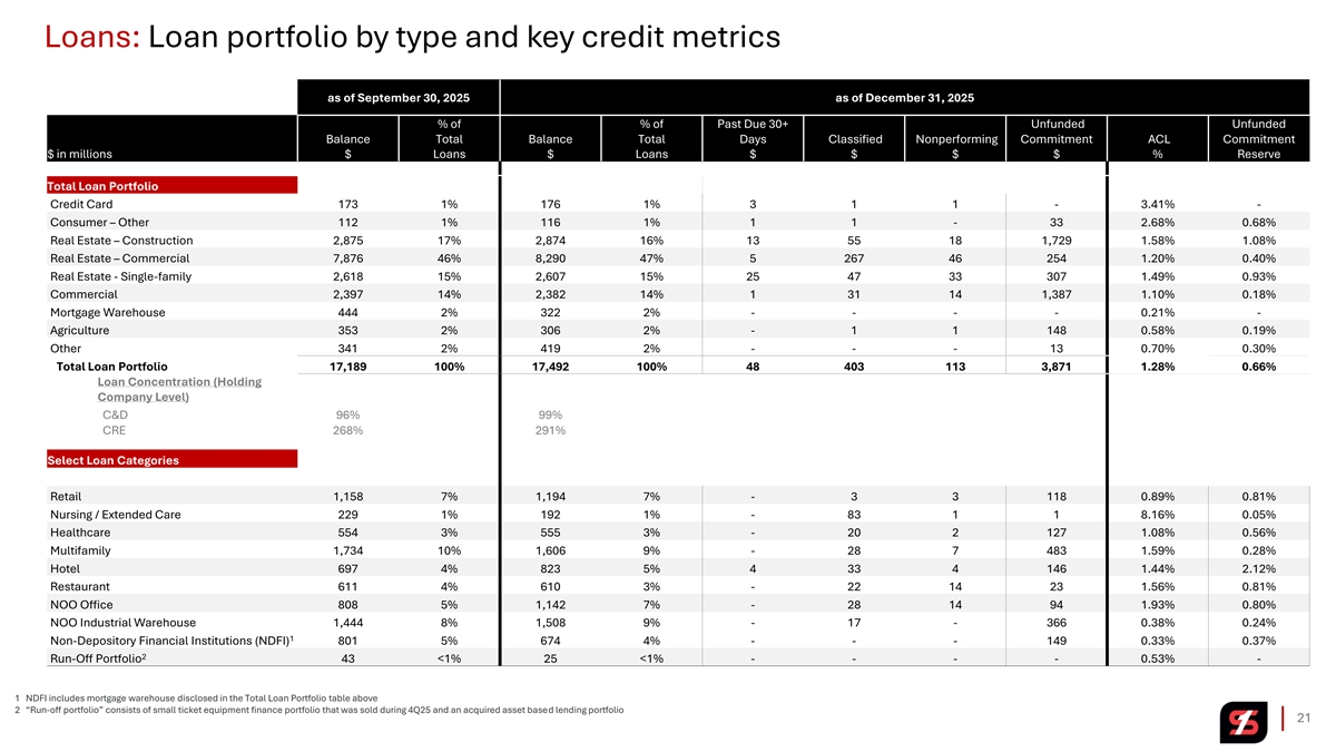 Loans: Loan portfolio by type and key credit metrics as of September 30, 2025 as of December 31, 2025 % of % of Past Due 30+ Unfunded Unfunded Balance Total Balance Total Days Classified Nonperforming Commitment ACL Commitment $ in millions $ Loans $ Loans $ $ $ $ % Reserve Total Loan Portfolio Credit Card 173 1% 176 1% 3 1 1 - 3.41% - Consumer – Other 112 1% 116 1% 1 1 - 33 2.68% 0.68% Real Estate – Construction 2,875 17% 2,874 16% 13 55 18 1,729 1.58% 1.08% Real Estate – Commercial 7,876 46% 8,290 47% 5 267 46 254 1.20% 0.40% Real Estate - Single-family 2,618 15% 2,607 15% 25 47 33 307 1.49% 0.93% Commercial 2,397 14% 2,382 14% 1 31 14 1,387 1.10% 0.18% Mortgage Warehouse 444 2% 322 2% - - - - 0.21% - Agriculture 353 2% 306 2% - 1 1 148 0.58% 0.19% Other 341 2% 419 2% - - - 13 0.70% 0.30% Total Loan Portfolio 17,189 100% 17,492 100% 48 403 113 3,871 1.28% 0.66% Loan Concentration (Holding Company Level) C&D 96% 99% CRE 268% 291% Select Loan Categories Retail 1,158 7% 1,194 7% - 3 3 118 0.89% 0.81% Nursing / Extended Care 229 1% 192 1% - 83 1 1 8.16% 0.05% Healthcare 554 3% 555 3% - 20 2 127 1.08% 0.56% Multifamily 1,734 10% 1,606 9% - 28 7 483 1.59% 0.28% Hotel 697 4% 823 5% 4 33 4 146 1.44% 2.12% Restaurant 611 4% 610 3% - 22 14 23 1.56% 0.81% NOO Office 808 5% 1,142 7% - 28 14 94 1.93% 0.80% NOO Industrial Warehouse 1,444 8% 1,508 9% - 17 - 366 0.38% 0.24% 1 Non-Depository Financial Institutions (NDFI) 801 5% 674 4% - - - 149 0.33% 0.37% 2 Run-Off Portfolio 43 <1% 25 <1% - - - - 0.53% - 1 NDFI includes mortgage warehouse disclosed in the Total Loan Portfolio table above 2 “Run-off portfolio” consists of small ticket equipment finance portfolio that was sold during 4Q25 and an acquired asset based lending portfolio 21