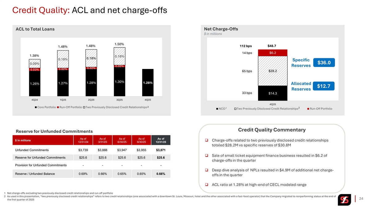 Credit Quality: Nonperforming and past due loans Nonperforming Loans Nonperforming Loans Evolution As of each quarter end $ in millions $ in millions $157.2 $153.9 $152.4 $2.7 $5.1 $153.9 $(4.3) $49.6 $(0.7) $49.3 $49.8 $112.7 $(3.2) $110.8 $8.5 $5.5 $3.5 $3.8 $3.3 $105.3 $104.1 $104.1 $101.3 $98.8 $112.7 $(40.8) 1 3Q25 Commercial RE – Commercial Consumer & Run-Off Two Previously 4Q25 4Q24 1Q25 2Q25 3Q25 4Q25 3 1 Single Family Portfolio Disclosed Credit Real Estate Other 1 2 Core Portfolio Run-Off Portfolio Two Previously Dislosed Credit Relationships 2 Relationships 4 4 4 Past Due 30-89 days / Total Loans Nonperforming Loans / Total Loans Nonperforming Assets / Total Assets Strategic decision to de-risk certain elements of the loan portfolio through the planned exit of particular acquired non- relationship credits Annual Annual Quarterly Quarterly Annual Quarterly 0.66% 0.92% 0.64% 0.96% 0.90% 0.89% 0.62% 0.61% 0.51% 0.51% 0.65% 0.65% 0.64% 0.64% 0.45% 0.45% 0.57% 0.50% 0.33% 0.46% 0.48% 0.44% 0.27% 0.63% 0.60% 0.61% 0.27% 0.37% 0.42% 0.60% 0.24% 0.21% 0.22% 0.22% 0.21% 0.31% 0.18% 0.17% 0.11% 0.23% NPL Ratio NPA to Assets 5 0.11% NPL Ratio, excluding Two Previously Disclosed Credit Relationships 5 NPA to Assets, excluding Two Previously Disclosed Credit Relationships 2020 2021 2022 2023 2024 2025 4Q24 1Q25 2Q25 3Q25 4Q25 2020 2021 2022 2023 2024 2025 4Q24 1Q25 2Q25 3Q25 4Q25 2020 2021 2022 2023 2024 2025 4Q24 1Q25 2Q25 3Q25 4Q25 Source: S&P Global Market Intelligence 2020 – 2024; Company Reports 1 “Run-off portfolio” consists of small ticket equipment finance and acquired asset based lending portfolios. Commercial change excludes the impact of loans included in the run-off portfolio2 2 As used in this presentation, “two previously disclosed credit relationships” refers to two credit relationships (one associated with a downtown St. Louis, Missouri, hotel and the other associated with a fast-food operator) that the Company migrated to nonperforming status at the end of the first quarter of 2025 3 Consumer & Other includes credit card, consumer-other, mortgage warehouse, agriculture and other loan portfolios 23 4 As of December 31, for each respective year shown above; quarterly data as of the end of the quarter for each respective period 5 Non-GAAP measures that management believes aid in the discussion of results. See appendix for Non-GAAP reconciliations