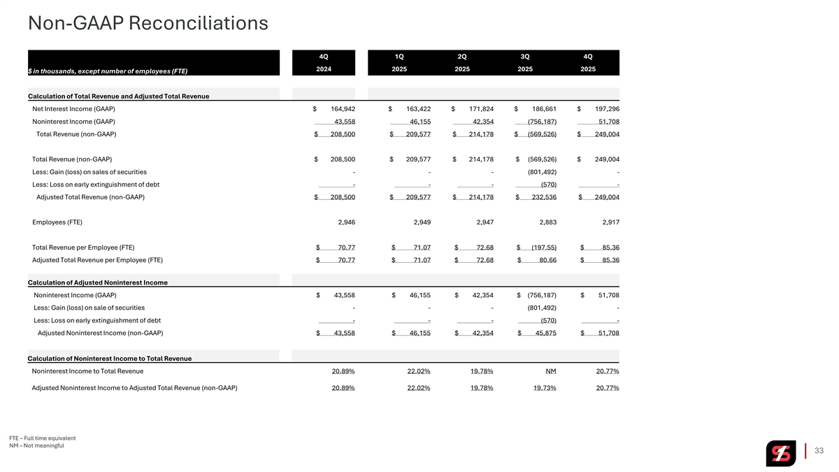 Non-GAAP Reconciliations 4Q 1Q 2Q 3Q 4Q 2024 2025 2025 2025 2025 $ in thousands Calculation of Pre-Provision Net Revenue (PPNR) Net interest income $ 164,942 $ 163,422 $ 171,824 $ 186,661 $ 197,296 Plus: Noninterest income 43,558 46,155 42,354 (756,187) 51,708 Less: Noninterest expense 141,117 144,580 138,589 142,032 139,862 Pre-Provision Net Revenue (PPNR) (non-GAAP) $ 67,383 $ 64,997 $ 75,589 $ (711,558) $ 109,142 Calculation of Adjusted Pre-Provision Net Revenue Pre-Provision Net Revenue (PPNR) (non-GAAP) $ 67,383 $ 64,997 $ 75,589 $ (711,558) $ 109,142 Plus: Loss on sale of equipment finance business - - - - 1,118 Plus: (Gain) loss on sale of securities - - - 801,492 - Plus: Branch right sizing costs, net 1,581 994 163 2,004 85 Plus: Early retirement program 200 - 1,594 305 - Plus: Loss on early extinguishment of debt - - - 570 - Plus: Termination of vendor and software services - - - - 12 Adjusted Pre-Provision Net Revenue (non-GAAP) $ 69,164 $ 65,991 $ 77,346 $ 92,813 $ 110,357 Calculation of PPNR and Adjusted PPNR Per Share Average Diluted Shares Outstanding 126,232,084 126,336,557 126,406,453 140,648,704 145,210,222 PPNR per Average Diluted Shares Outstanding $ 0.53 $ 0.51 $ 0.60 $ (5.06) $ 0.75 Adjusted PPNR per Average Diluted Shares Outstanding (non-GAAP) $ 0.55 $ 0.52 $ 0.61 $ 0.66 $ 0.76 Calculation of Book Value and Tangible Book Value per Share Total common stockholders' equity $ 3,528,872 $ 3,531,485 $ 3,549,210 $ 3,353,963 $ 3,419,240 Intangible assets: Goodwill (1,320,799) (1,320,799) (1,320,799) (1,320,799) (1,320,799) Other intangible assets (97,242) (93,714) (90,617) (87,520) (84,423) Total intangible assets (1,418,041) (1,414,513) (1,411,416) (1,408,319) (1,405,222) Tangible common stockholders' equity (non-GAAP) $ 2,110,831 $ 2,116,972 $ 2,137,794 $ 1,945,644 $ 2,014,018 Shares of common stock outstanding 125,651,540 125,926,822 125,996,248 144,703,075 144,762,817 Book value per common share $ 28.08 $ 28.04 $ 28.17 $ 23.18 $ 23.62 Tangible book value per common share (non-GAAP) $ 16.80 $ 16.81 $ 16.97 $ 13.45 $ 13.91 32