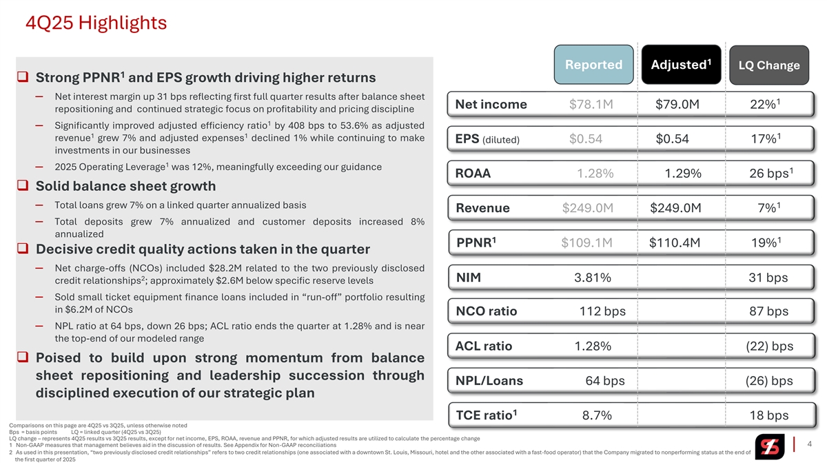 4Q25 Highlights 1 Reported Adjusted LQ Change 1 ❑ Strong PPNR and EPS growth driving higher returns ─ Net interest margin up 31 bps reflecting first full quarter results after balance sheet 1 Net income $78.1M $79.0M 22% repositioning and continued strategic focus on profitability and pricing discipline 1 ─ Significantly improved adjusted efficiency ratio by 408 bps to 53.6% as adjusted 1 1 1 revenue grew 7% and adjusted expenses declined 1% while continuing to make EPS (diluted) $0.54 $0.54 17% investments in our businesses 1 ─ 2025 Operating Leverage was 12%, meaningfully exceeding our guidance 1 ROAA 1.28% 1.29% 26 bps ❑ Solid balance sheet growth ─ Total loans grew 7% on a linked quarter annualized basis 1 Revenue $249.0M $249.0M 7% ─ Total deposits grew 7% annualized and customer deposits increased 8% annualized 1 1 PPNR $109.1M $110.4M 19% ❑ Decisive credit quality actions taken in the quarter ─ Net charge-offs (NCOs) included $28.2M related to the two previously disclosed 2 NIM 3.81% 31 bps credit relationships ; approximately $2.6M below specific reserve levels ─ Sold small ticket equipment finance loans included in “run-off” portfolio resulting in $6.2M of NCOs NCO ratio 112 bps 87 bps ─ NPL ratio at 64 bps, down 26 bps; ACL ratio ends the quarter at 1.28% and is near the top-end of our modeled range ACL ratio 1.28% (22) bps ❑ Poised to build upon strong momentum from balance sheet repositioning and leadership succession through NPL/Loans 64 bps (26) bps disciplined execution of our strategic plan 1 TCE ratio 8.7% 18 bps Comparisons on this page are 4Q25 vs 3Q25, unless otherwise noted Bps = basis points LQ = linked quarter (4Q25 vs 3Q25) LQ change – represents 4Q25 results vs 3Q25 results, except for net income, EPS, ROAA, revenue and PPNR, for which adjusted results are utilized to calculate the percentage change 1 Non-GAAP measures that management believes aid in the discussion of results. See Appendix for Non-GAAP reconciliations 4 2 As used in this presentation, “two previously disclosed credit relationships” refers to two credit relationships (one associated with a downtown St. Louis, Missouri, hotel and the other associated with a fast-food operator) that the Company migrated to nonperforming status at the end of the first quarter of 2025