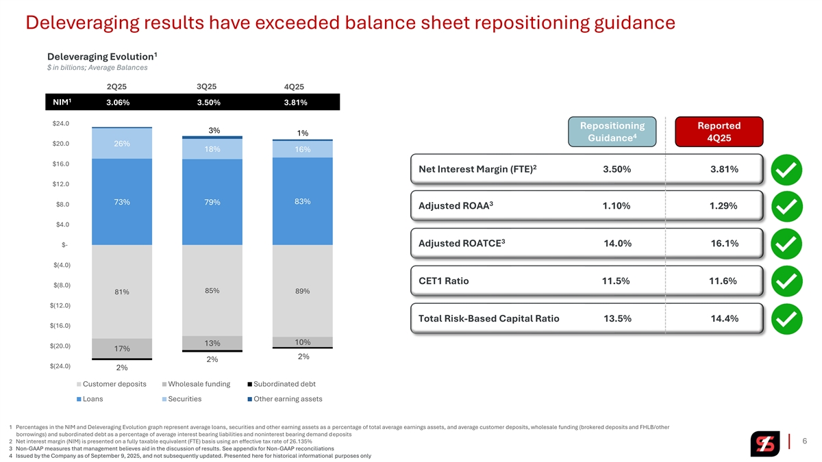 Income Statement Highlights 2 2 Net Interest Income Adjusted Total Revenue Adjusted PPNR $ in millions $ in millions $ in millions +19% +20% +60% $249.0 $197.3 $110.4 $232.5 $186.7 $92.8 7% 6% $214.2 19% $77.3 $209.6 $171.8 $208.5 $69.2 $66.0 $164.9 $163.4 4Q24 1Q25 2Q25 3Q25 4Q25 4Q24 1Q25 2Q25 3Q25 4Q25 4Q24 1Q25 2Q25 3Q25 4Q25 1 NIM 2.87% 3.50% 3.81% 2.95% 3.06% 2 2 2 Adjusted NIE Adjusted Net Income Adjusted Diluted EPS $ in millions $ in millions +59% +38% (0.5)% $79.0 $143.6 $0.54 $64.9 $0.46 $139.7 $0.44 $139.3 $56.1 $138.6 $0.39 $49.6 22% 17% $136.8 (1)% $33.1 $0.26 4Q24 1Q25 2Q25 3Q25 4Q25 4Q24 1Q25 2Q25 3Q25 4Q25 4Q24 1Q25 2Q25 3Q25 4Q25 PPNR – Pre-provision net revenue NIE – Noninterest Expense 5 EPS – Earnings per Share 1 Net interest margin (NIM) is presented on a fully taxable equivalent (FTE) basis using an effective tax rate of 26.135% 2 Non-GAAP measures that management believes aid in the discussion of results. See appendix for Non-GAAP reconciliations