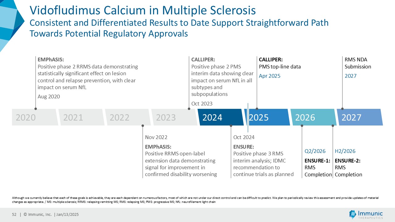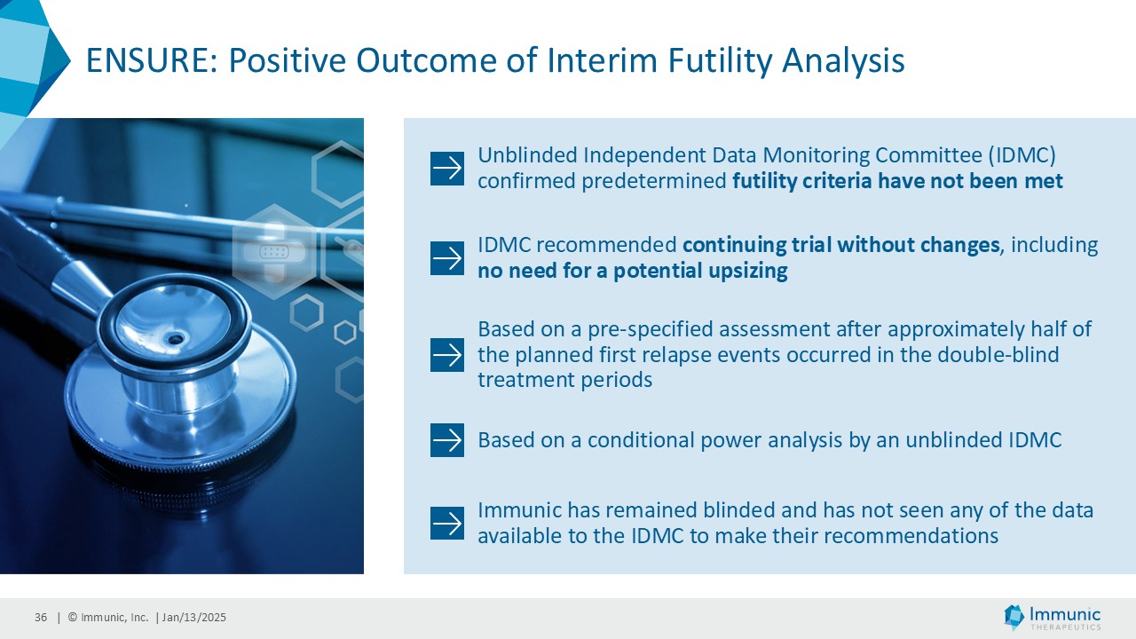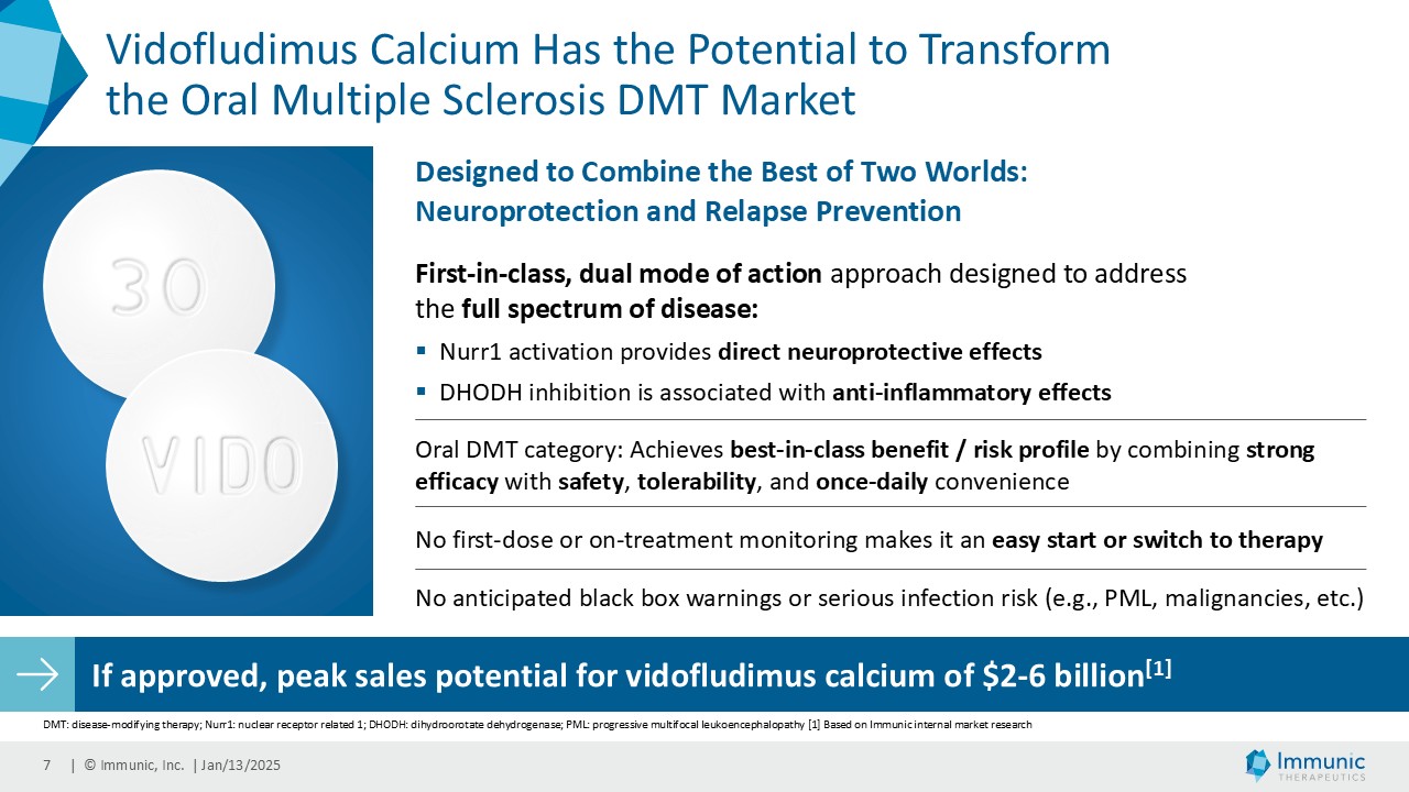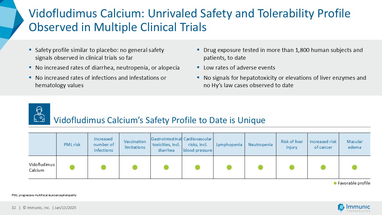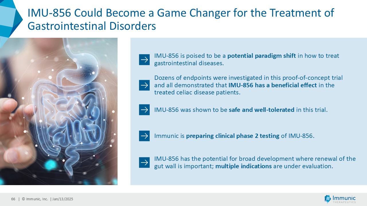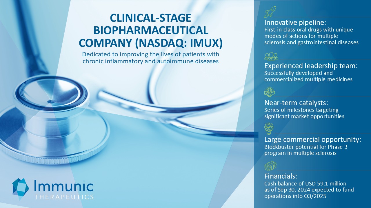Certain statements in this Current Report on Form 8-K and the Presentation are “forward-looking statements” that involve substantial risks and uncertainties for purposes of the safe harbor provided by the Private Securities Litigation Reform Act of 1995. All statements, other than statements of historical facts, included in this Current Report on Form 8-K and the Presentation regarding new management hires and promotions, strategy, future operations, future financial position, future revenue, projected expenses, sufficiency of cash and cash runway, expected timing, development and results of clinical trials, prospects, plans and objectives of management are forward-looking statements. Examples of such statements include, but are not limited to, statements relating to Immunic’s development programs and the targeted diseases; announcments regarding the positive outcomes of the interim analysis of the phase 3 ENSURE trials; the potential for Immunic’s development programs to safely and effectively target diseases; preclinical and clinical data for Immunic’s development programs; the timing of current and future clinical trials and anticipated clinical milestones; the nature, strategy and focus of the Company and further updates with respect thereto; the development and commercial potential of any product candidates of the Company; expectations regarding the capitalization, resources and ownership structure of the Company; the executive and board structure of the Company; and the Company‘s expected cash runway. Immunic may not actually achieve the plans, carry out the intentions or meet the expectations or projections disclosed in the forward-looking statements and you should not place undue reliance on these forward-looking statements. Such statements are based on management's current expectations and involve substantial risks and uncertainties. Actual results and performance could differ materially from those projected in the forward-looking statements as a result of many factors, including, without limitation, the COVID-19 pandemic, increasing inflation, impacts of the Ukraine – Russia conflict and the conflict in the Middle East on planned and ongoing clinical trials, risks and uncertainties associated with the ability to project future cash utilization and reserves needed for contingent future liabilities and business operations, the availability of sufficient financial and other resources to meet business objectives and operational requirements, including the ability to satisfy the minimum average price and trading volume conditions required to receive funding in tranche 2 and 3 of the January 2024 private placement, the fact that the results of earlier preclinical studies and clinical trials may not be predictive of future clinical trial results, the protection and market exclusivity provided by Immunic's intellectual property, risks related to the drug development and the regulatory approval process and the impact of competitive products and technological changes. A further list and descriptions of these risks, uncertainties and other factors can be found in the section captioned "Risk Factors," in the Company's Annual Report on Form 10-K for the fiscal year ended December 31, 2023, filed with the SEC on February 22, 2024, and in the Company's subsequent filings with the SEC. Copies of these filings are available online at www.sec.gov or ir.imux.com/sec-filings.
