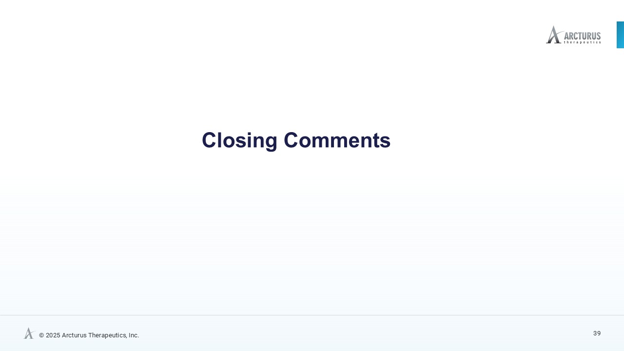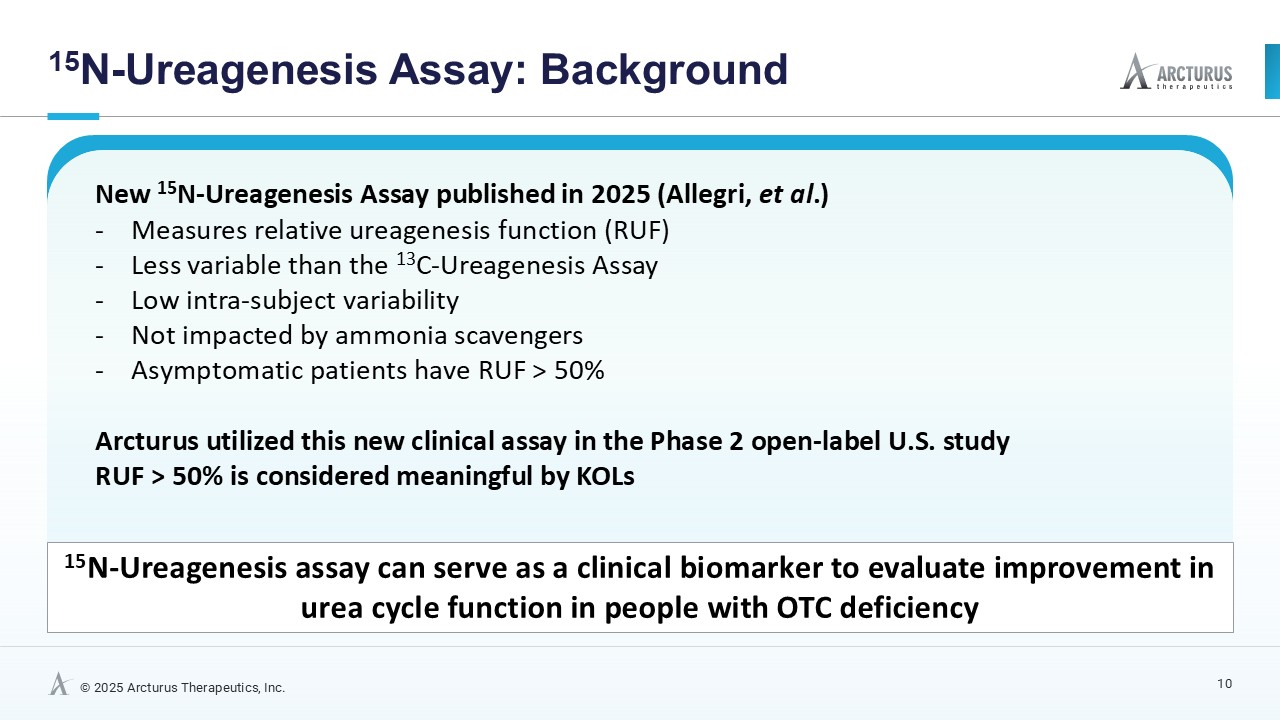 “We are very pleased with these new ARCT-810 clinical results, where we have achieved strong biological effects in both Phase 2 studies, including significant and consistent reduction and normalization of abnormally elevated glutamine, an important biomarker to monitor urea cycle function,” said Dr. Juergen Froehlich, Chief Medical Officer of Arcturus. “Furthermore, in our ongoing U.S. Phase 2 study, we are excited to report the first significant relative ureagenesis function (RUF) improvements using a new and optimized 15N-ureagenesis assay. Along with the observation of stable ammonia levels in all patients during treatment, these data add a level of robustness to this new interim dataset. I am also very pleased to see that our LUNAR® delivery technology continues to be generally safe and well tolerated. The combined biomarker data is unprecedented for an mRNA rare disease therapeutic and, importantly, provides a potentially accelerated path forward to a multi-biomarker driven pivotal study.”
