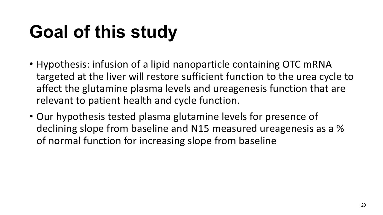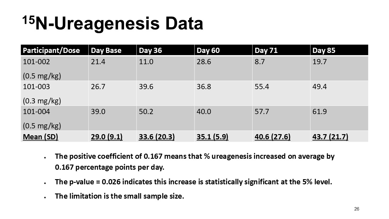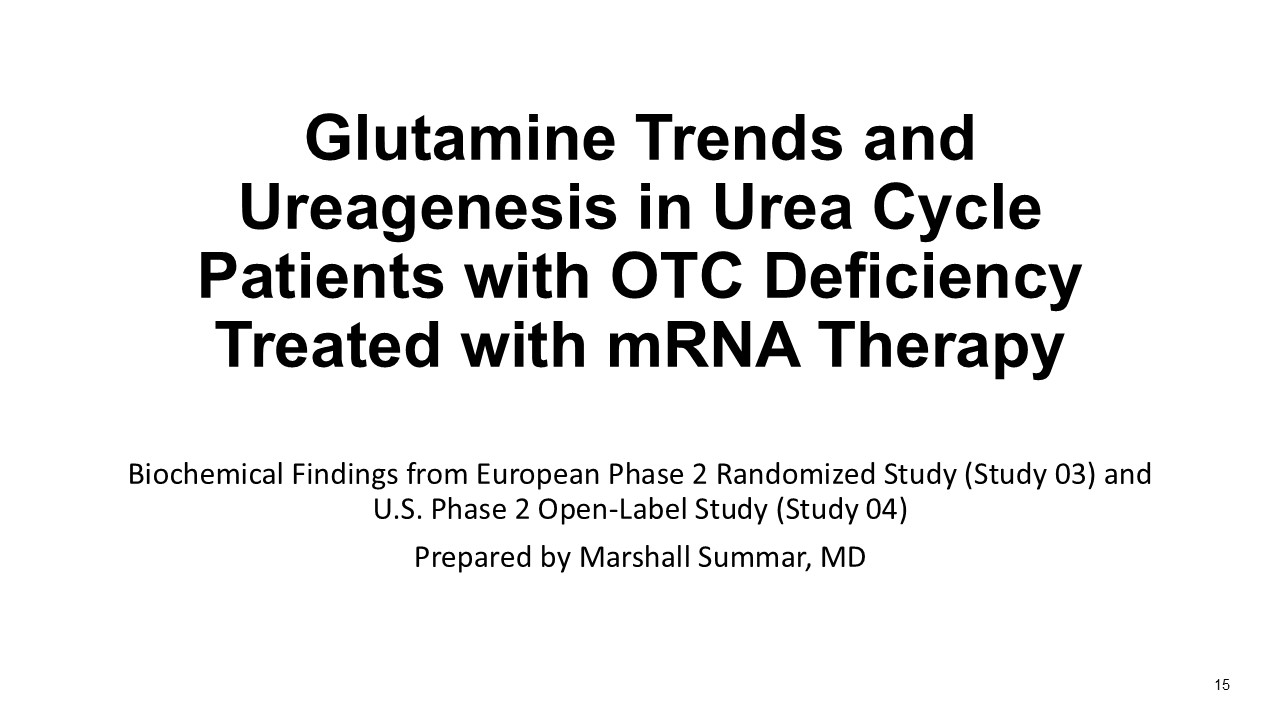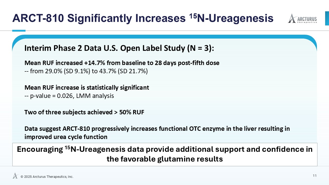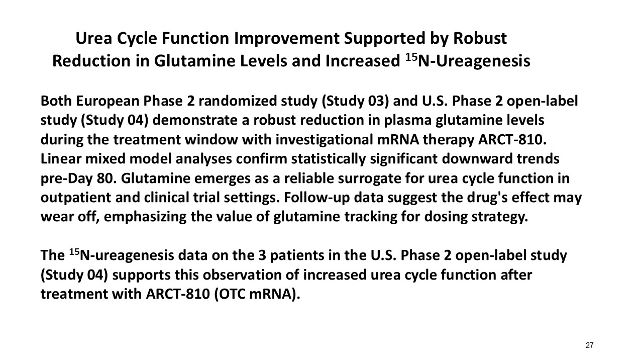 In the first three participants in the ongoing Phase 2 open-label study, RUF statistically (p-value = 0.026, LMM) increased at all post treatment evaluations from a baseline of 29.0% (SD; 9.1%) to 43.7% (SD; 21.7%) at 28 days post-fifth dose. These results suggest a progressive increase of functional OTC enzyme in the liver with continued administrations. Two of the three participants achieved RUF > 50% indicating a clinically meaningful improvement in urea cycle flux. These encouraging 15N-Ureagenesis data provide additional support and confidence in the favorable glutamine results.