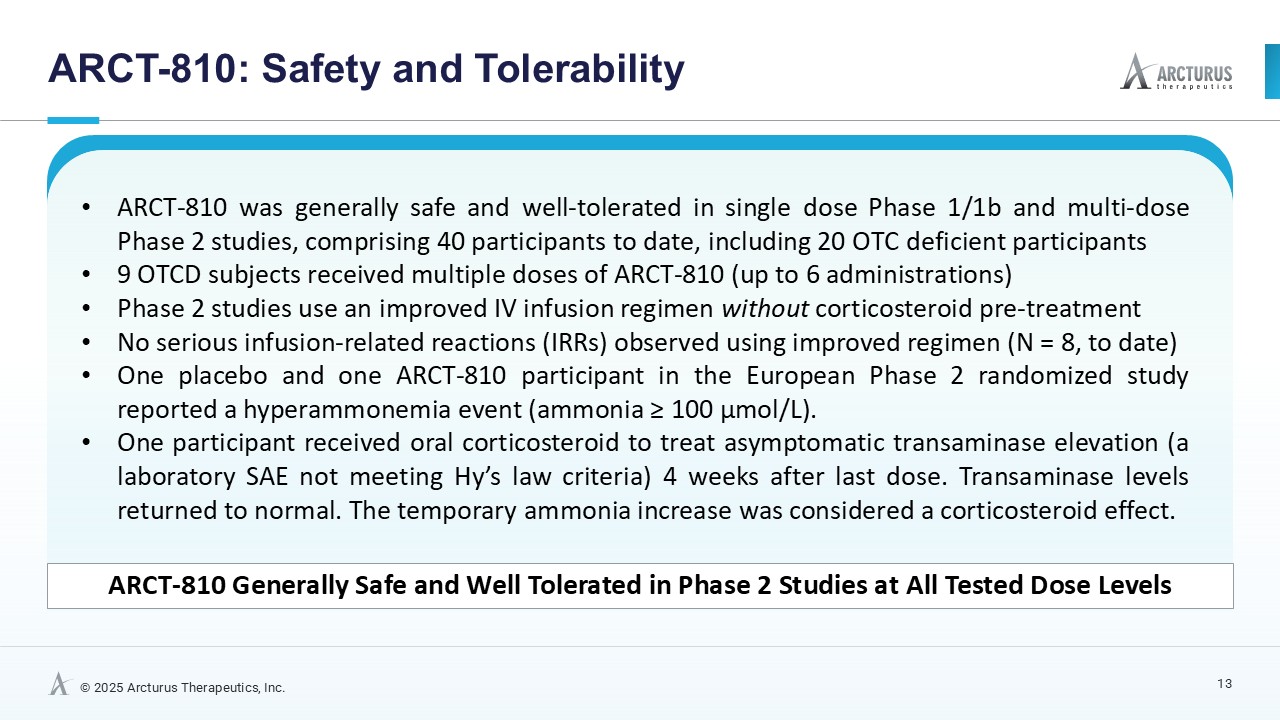 ARCT-810 was generally safe and well tolerated in single dose Phase 1/1b and multi-dose Phase 2 studies, comprising 40 participants to date, including 20 OTC deficient participants. The early studies enabled the Company to improve the tolerability of the infusion regimen without using corticosteroid pre-treatment. To date, no serious IRRs have been observed using the improved 3-hour IV regimen (N = 8; up to 6 infusions) in the Phase 2 protocols.
