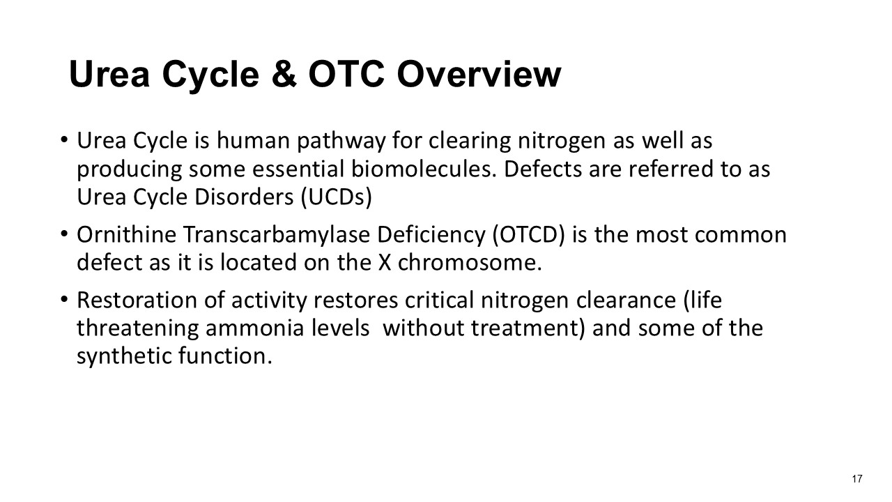 Ornithine transcarbamylase (OTC) deficiency is the most common urea cycle disorder. Urea cycle disorders are a group of inherited metabolic disorders of the liver that make it difficult for affected patients to remove toxic waste products as proteins are digested. OTC deficiency caused by mutations in the X-linked OTC gene, leads to a non-functional or deficient OTC enzyme and usually affects males more severely. OTC is a critical liver enzyme which catalyzes a metabolic process that converts toxic ammonia to urea that is excreted by the kidney. This conversion does not occur properly in patients with OTC deficiency and, aside from the risk of high ammonia levels, leads to increased blood concentrations of glutamine with low to normal levels of citrulline and increases in urine orotic acid. High blood ammonia levels in OTC deficiency may cause health crises with seizures, progressive neurocognitive impairment, coma, and death. Severe cases of OTC deficiency usually present early in life, but patients with less severe symptoms may be diagnosed as adolescents and adults. There is currently no cure for OTC deficiency, apart from liver transplant. However, liver transplantation comes with significant risks of surgical and postsurgical complications such as organ rejection, and recipients must take immunosuppressant drugs for the rest of their lives. The current standard of care for OTC deficiency patients is a well-controlled, but challenging to maintain, low-protein diet, substitution of essential amino acids and treatment with nitrogen scavenging medications that keeps the ammonia from rising to acutely toxic levels but may not prevent chronic neurotoxic effects. These treatments do not address the underlying cause of disease. In Europe and the U.S., approximately 10,000 people have OTC deficiency.