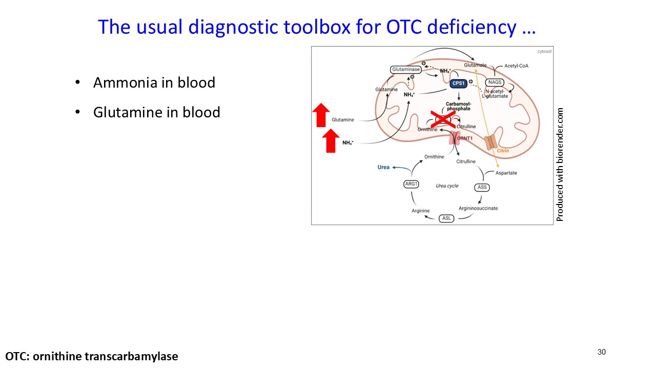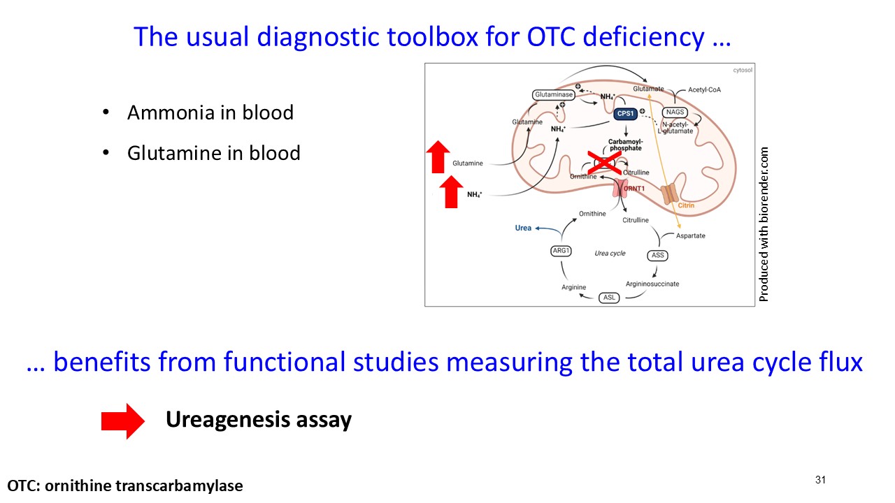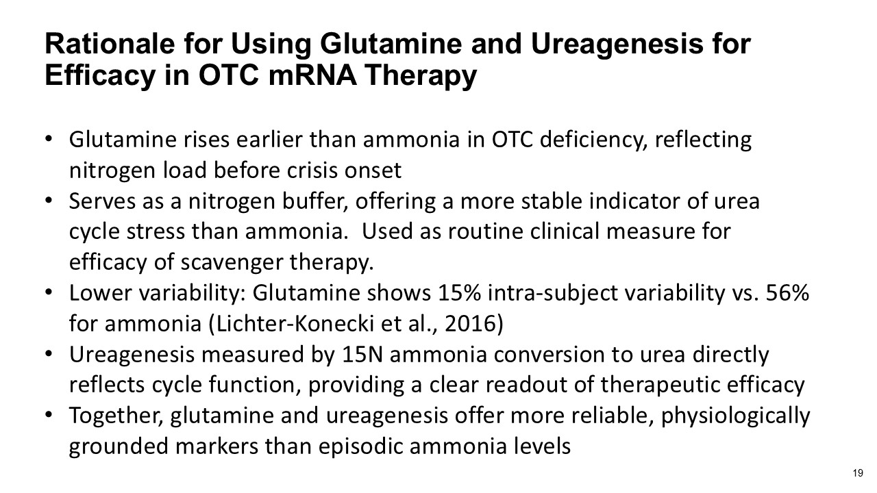 Glutamine is used as an important biomarker by clinicians to monitor urea cycle function in OTC deficient patients. Glutamine reflects the body’s nitrogen buffering capacity. In urea cycle disorders, excess nitrogen is initially incorporated into glutamine, allowing glutamine to rise steadily as a compensatory mechanism before ammonia levels begin to spike. This role makes glutamine a more stable and predictive biomarker in patients who are not experiencing hyperammonemia. Glutamine assessments have significantly lower intra-subject variability than ammonia (15% vs. 56%), making it more reliable for monitoring metabolic control in stable conditions (Lichter-Konecki et al., 2016).