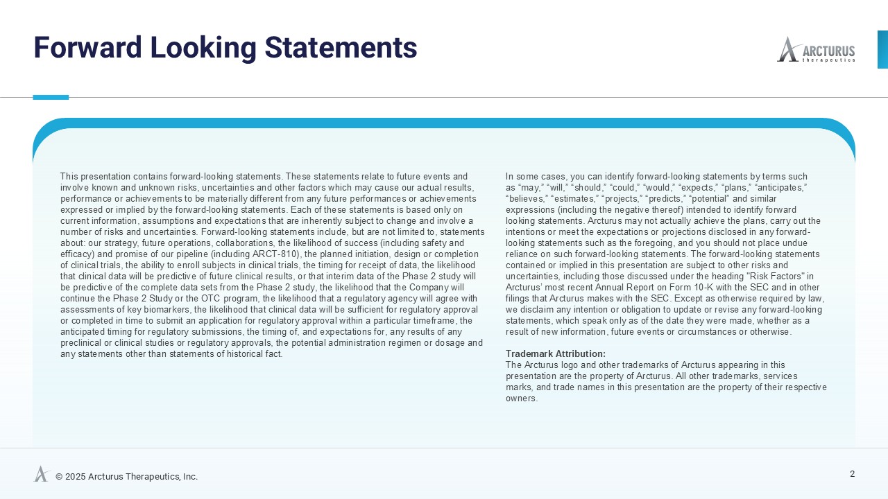 This press release contains forward-looking statements that involve substantial risks and uncertainties for purposes of the safe harbor provided by the Private Securities Litigation Reform Act of 1995. Any statements, other than statements of historical fact included in this press release, are forward-looking statements, including those regarding strategy, future operations, the likelihood of success of the Company’s pipeline (including ARCT-810), the likelihood that clinical results will be predictive of future clinical results or of potential therapeutic benefit, likelihood of continuation of the OTC program, likelihood of further enrollment in the ongoing ARCT-810 Phase 2 study, the likelihood of a path toward and initiation of a multi-biomarker driven pivotal study, the likelihood that continued ARCT-810 administrations will result in a progressive increase of functional OTC enzyme, the likelihood of any regulatory agency recognizing any biomarker in determinations of regulatory approval including glutamine levels or 15N assay results, and the impact of general business and economic conditions. Arcturus may not actually achieve the plans, carry out the intentions or meet the expectations or projections disclosed in any forward-looking statements such as the foregoing and you should not place undue reliance on such forward-looking statements. These statements are only current predictions or expectations, and are subject to known and unknown risks, uncertainties, and other factors that may cause our or our industry’s actual results, levels of activity, performance or achievements to be materially different from those anticipated by the forward-looking statements, including those discussed under the heading "Risk Factors" in Arcturus’ most recent Annual Report on Form 10-K, and in subsequent filings with, or submissions to, the Securities and Exchange Commission (the “SEC”), which are available on the SEC’s website at www.sec.gov. Except as otherwise required by law, Arcturus disclaims any intention or obligation to update or revise any forward-looking statements, which speak only as of the date they were made, whether as a result of new information, future events or circumstances or otherwise.
