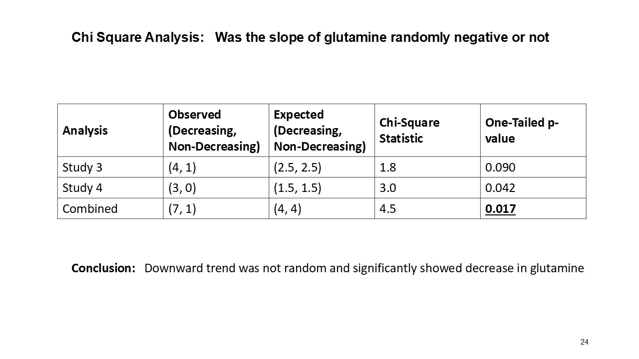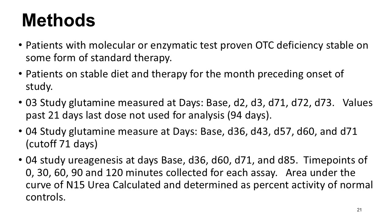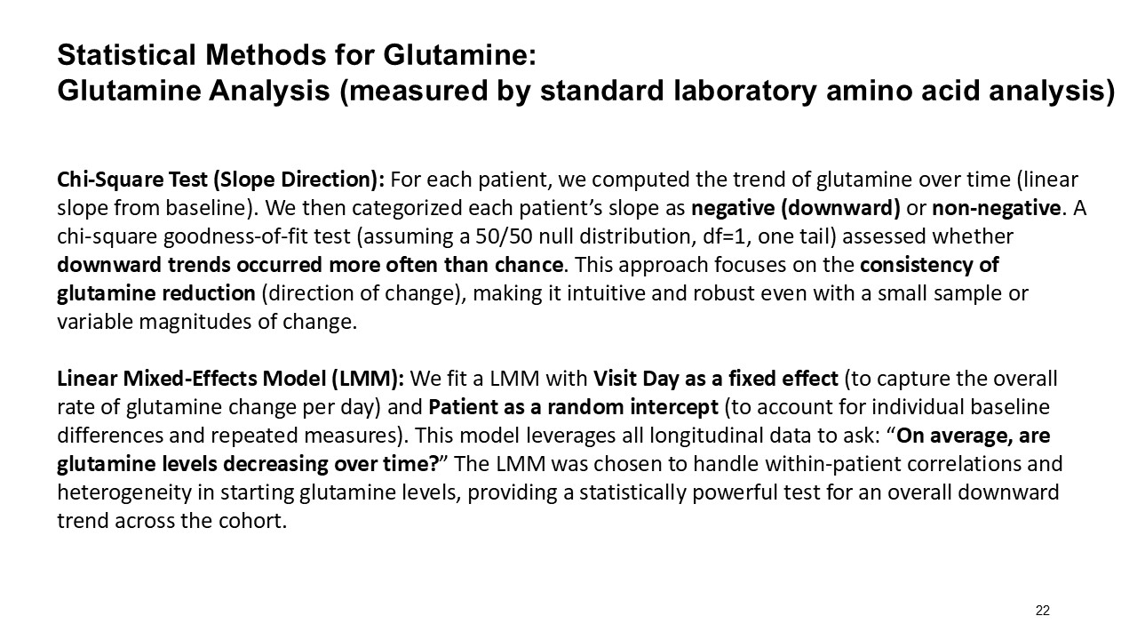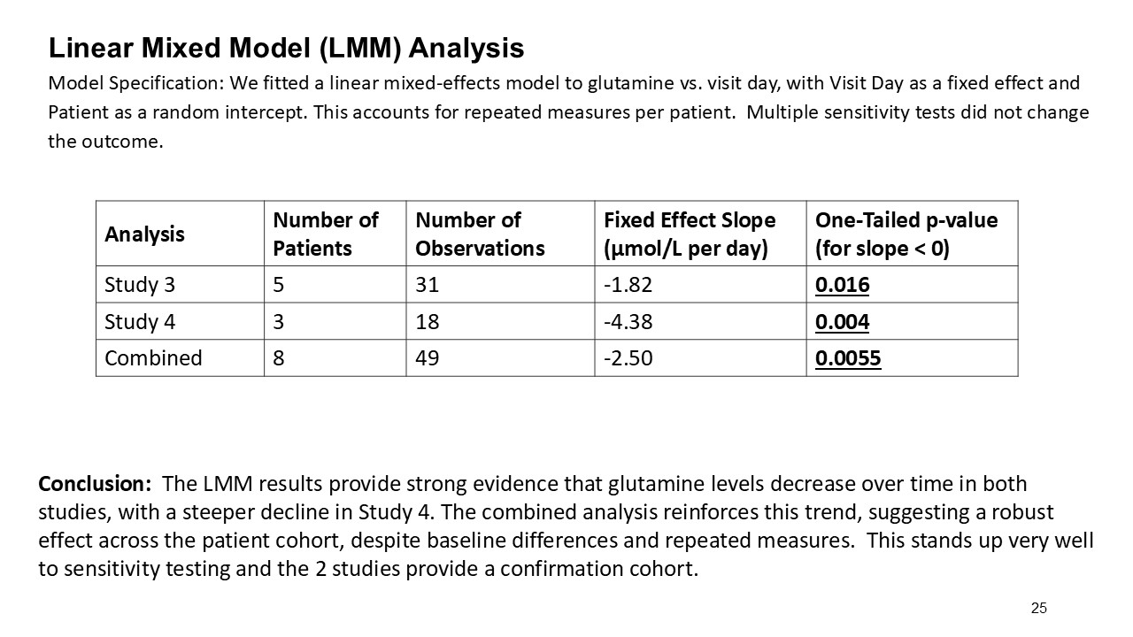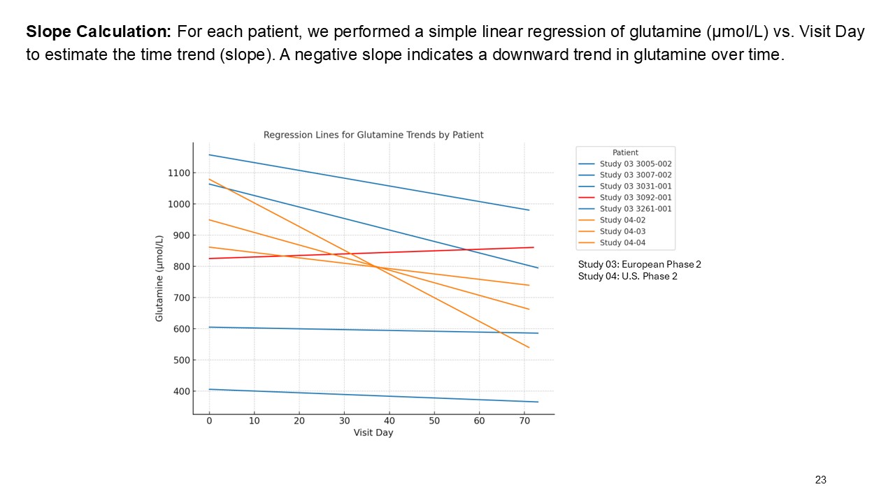 These results provide strong evidence that glutamine levels decreased in both Phase 2 studies, with a steeper decline in the U.S. Phase 2 study, likely attributed to the two participants with more severe disease. After treatment completion, glutamine levels returned to baseline over a period of several weeks.