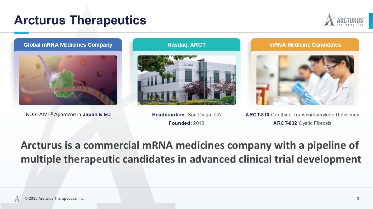 Founded in 2013 and based in San Diego, California, Arcturus Therapeutics Holdings Inc. (Nasdaq: ARCT) is a commercial mRNA medicines and vaccines company with enabling technologies: (i) LUNAR® lipid-mediated delivery, (ii) STARR® mRNA technology (sa-mRNA) and (iii) mRNA drug substance along with drug product manufacturing expertise. Arcturus developed KOSTAIVE®, the first self-amplifying messenger RNA (sa-mRNA) COVID vaccine in the world to be approved. Arcturus has an ongoing global collaboration for innovative mRNA vaccines with CSL Seqirus, and a joint venture in Japan, ARCALIS, focused on the manufacture of mRNA vaccines and therapeutics. Arcturus’ pipeline includes RNA therapeutic candidates to potentially treat OTC deficiency and cystic fibrosis (CF), along with its partnered mRNA vaccine programs for SARS-CoV-2 (COVID-19) and influenza. Arcturus’ versatile RNA therapeutics platforms can be applied toward multiple types of nucleic acid medicines including messenger RNA, small interfering RNA, circular RNA, antisense RNA, self-amplifying RNA, DNA, and gene editing therapeutics. Arcturus' technologies are covered by its extensive patent portfolio (over 500 patents and patent applications in the U.S., Europe, Japan, China, and other countries). For more information, visit www.ArcturusRx.com. In addition, please connect with us on X (formally Twitter) and LinkedIn.
