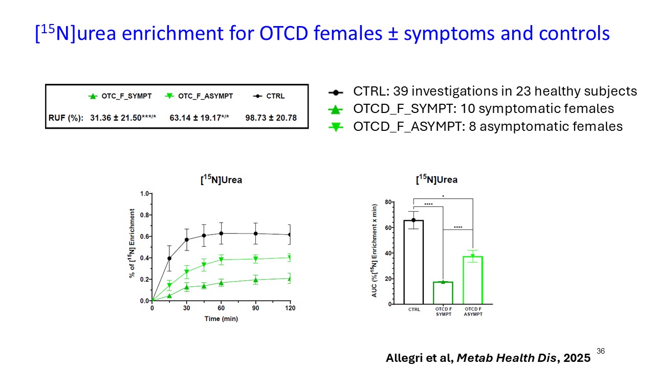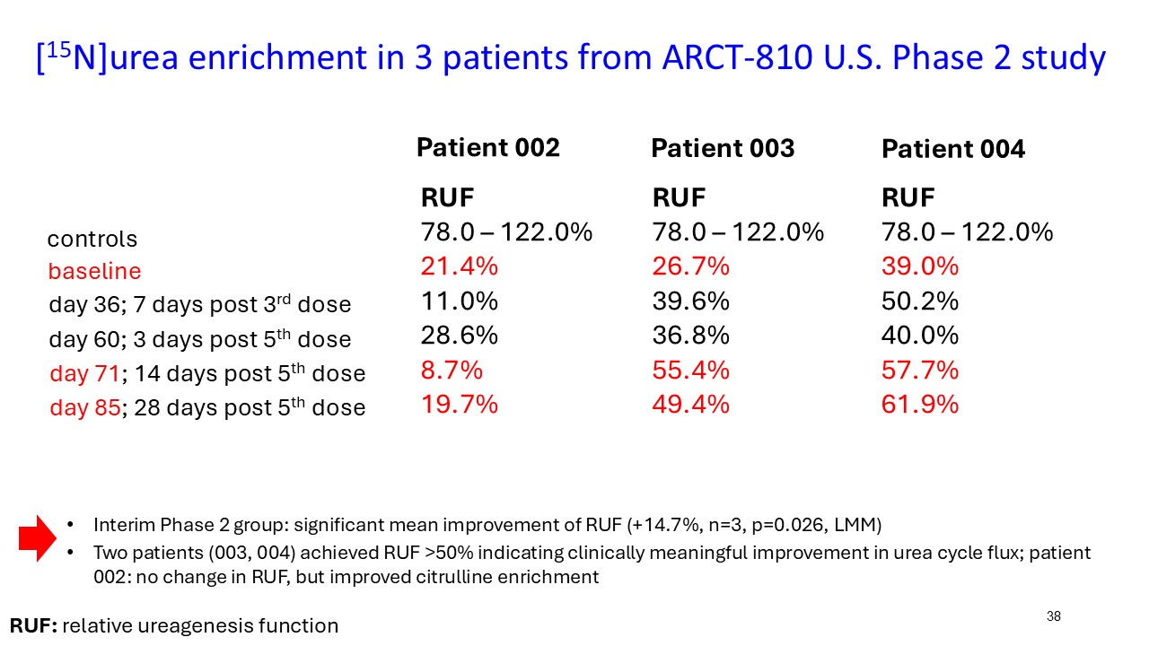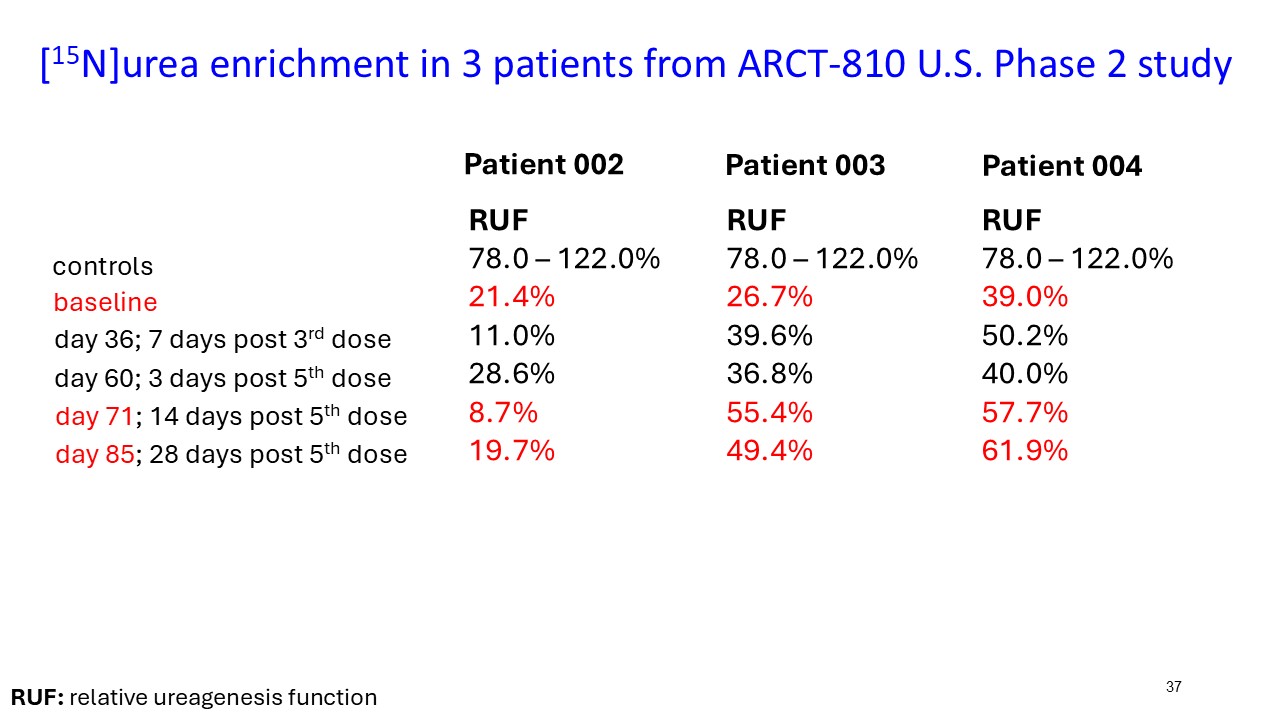 Multiple dosing data are available from two Phase 2 studies; a completed placebo-controlled study in Europe that randomized six participants to ARCT-810 doses and an open-label multiple ascending dose study with interim data from the initial three completed participants. The ongoing U.S. Phase 2 open-label study uses a modified and improved 15N-ureagenesis assay (Allegri et al., 2025). The assay measures relative ureagenesis function (RUF) against a normal range established from healthy controls (N = 29). The assay is not impacted by ammonia scavengers, has low intraindividual variability, and can distinguish between symptomatic and asymptomatic OTC deficient patients. Linear Mixed-Effects Model (LMM) was applied as an exploratory analysis to the Phase 2 glutamine and ureagenesis data. LMM is suitable for small-N analyses, i.e. rare disease trial datasets.