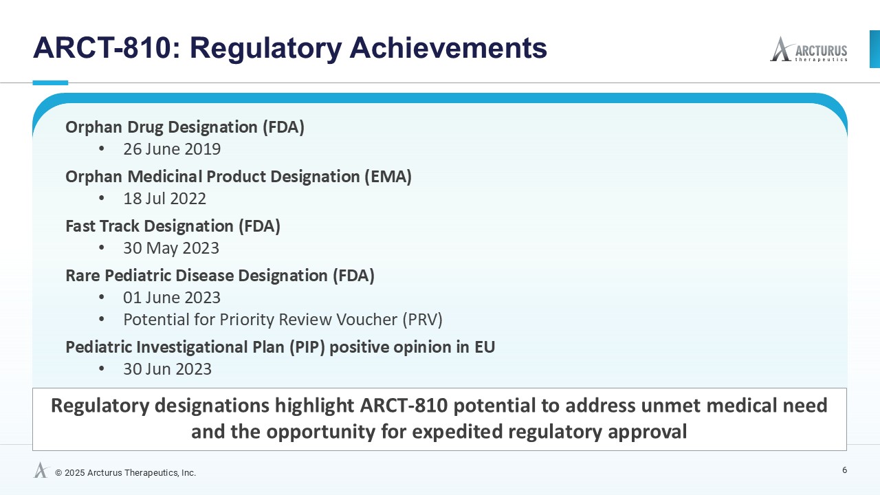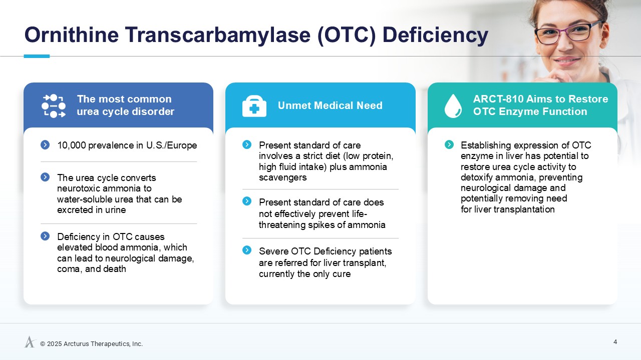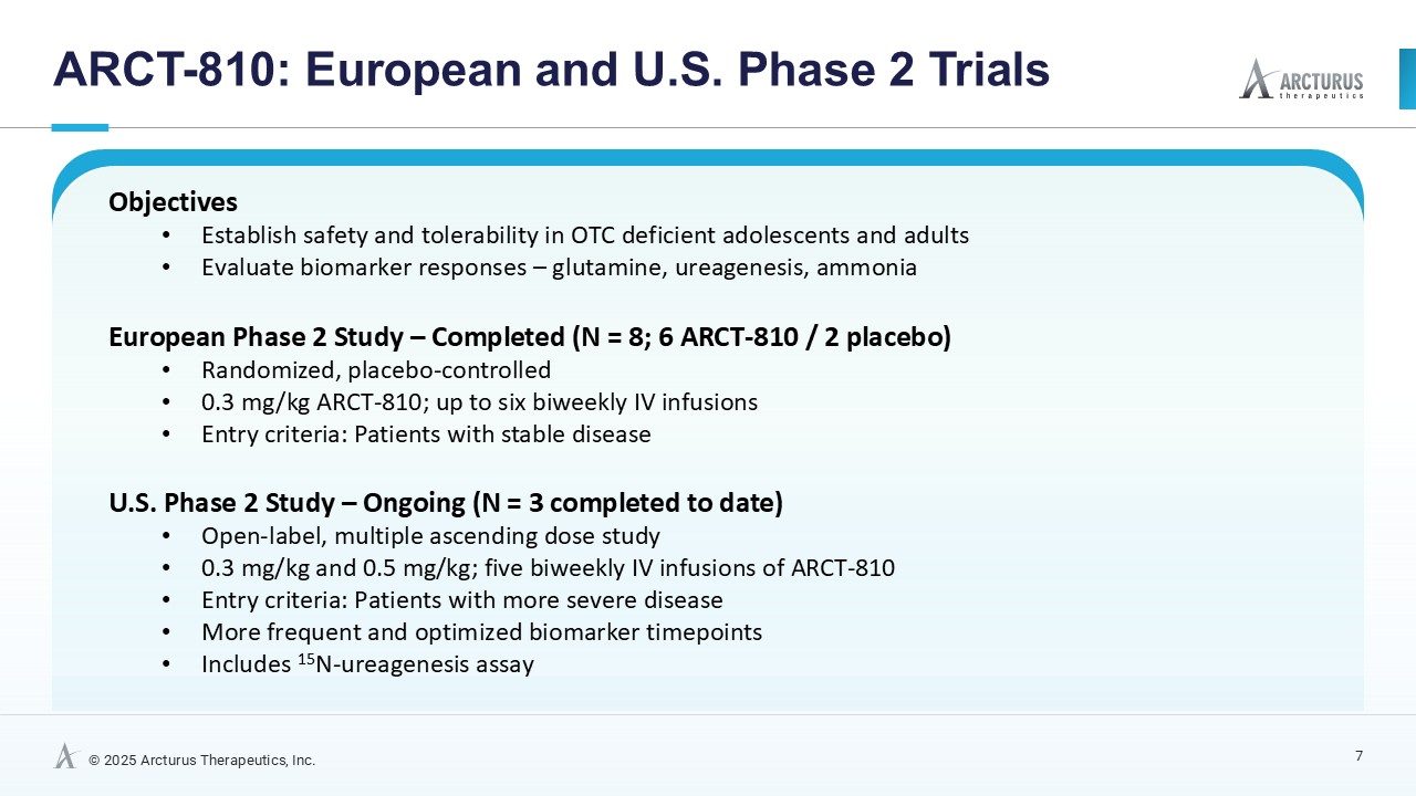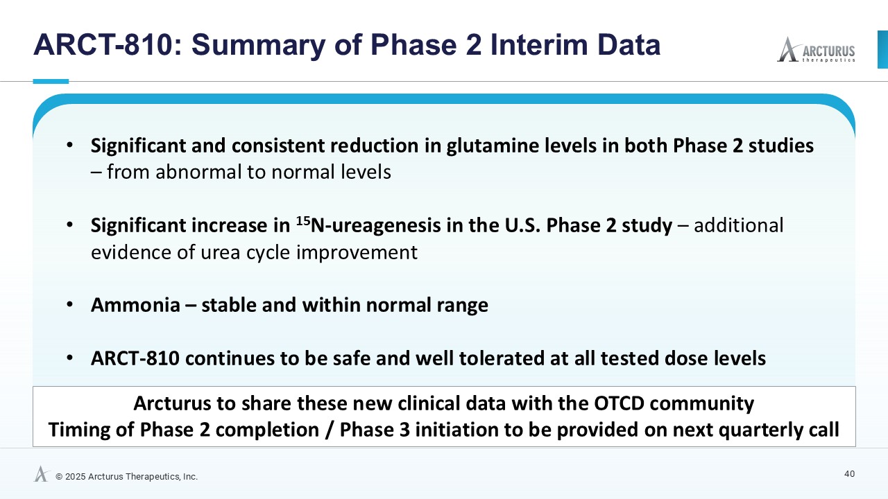 SAN DIEGO--(BUSINESS WIRE)--Jun. 30, 2025-- Arcturus Therapeutics Holdings Inc. (the “Company”, “Arcturus”, Nasdaq: ARCT), a commercial messenger RNA medicines company focused on the development of infectious disease vaccines and opportunities within liver and respiratory rare diseases, today announces positive Phase 2 interim results in people with OTC deficiency treated with ARCT-810, an mRNA therapeutic candidate designed to replace the OTC enzyme and restore urea cycle activity preventing hyperammonemia crises.