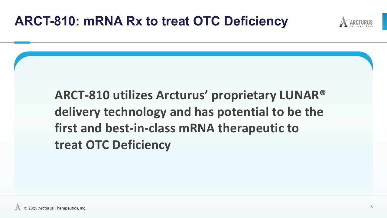 ARCT-810 is an intravenously administered investigational mRNA therapeutic designed to express normal functional OTC enzyme in the liver of individuals with OTC deficiency. ARCT-810 has received Orphan Medicinal Product Designation and an approved pediatric investigation plan (PIP) from the European Medicines Agency (EMA), and Orphan Drug Designation, Fast Track Designation along with Rare Pediatric Disease Designation from the U.S. Food and Drug Administration (FDA) for the treatment of OTC deficiency. OTC is a key enzyme in the urea cycle which converts toxic ammonia into urea. Elevated ammonia can lead to metabolic crises with progressive and irreversible neurocognitive damage. A safe and effective mRNA therapeutic may restore normal functional OTC enzyme in the liver which could improve urea cycle activity, reduce abnormally elevated glutamine, maintain normal ammonia levels and potentially eliminate the risk of future metabolic crises. ARCT-810 is based on Arcturus’ mRNA design construct and proprietary manufacturing process. ARCT-810 also utilizes Arcturus’ extensive and propriety lipid library and employs the Company's LUNAR® delivery platform to deliver OTC mRNA to hepatocytes.