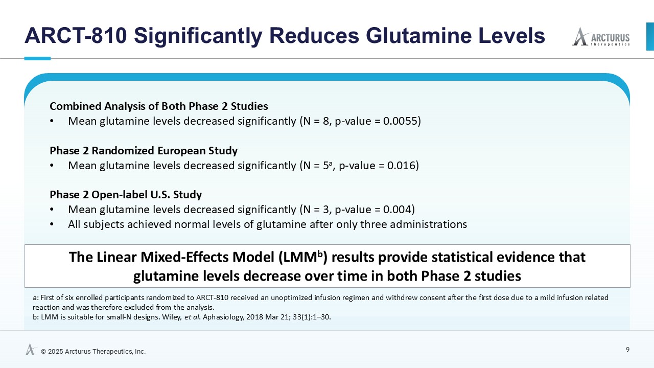 In the combined analysis of both Phase 2 studies, significantly (p-value = 0.0055; LMM) decreased glutamine levels were observed following multiple ARCT-810 administrations to patients who remained on their standard of care therapy. These results provide statistical evidence that glutamine levels decrease over time in both Phase 2 studies, suggesting a robust effect across the patient cohorts. In the Phase 2 randomized European study, glutamine levels in patients who received multiple doses of ARCT-810 significantly (p-value = 0.016; LMM) decreased during the dosing period. In the Phase 2 open-label U.S. study, all three participants had a sustained and significant (p-value = 0.004; LMM) decrease in glutamine from baseline reaching normal levels after the first three doses.