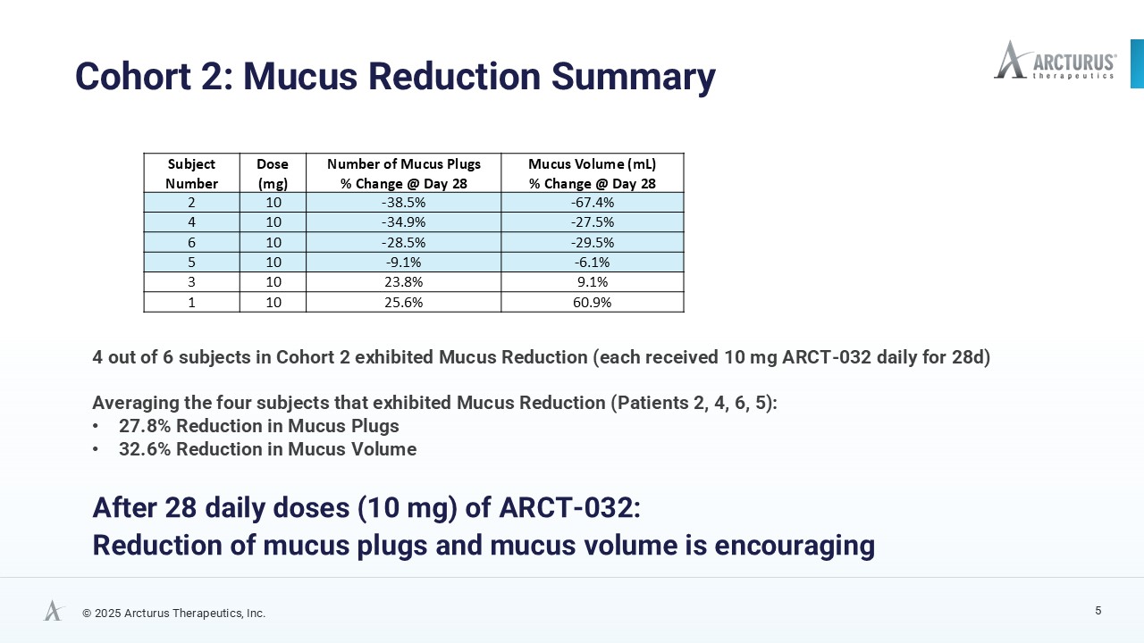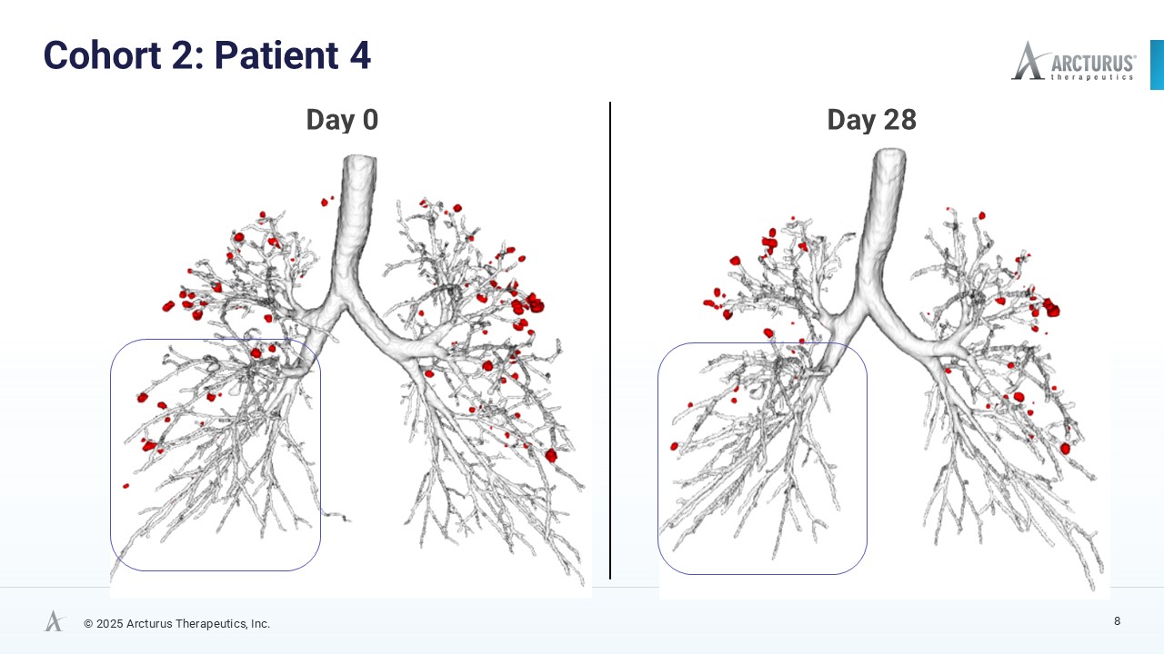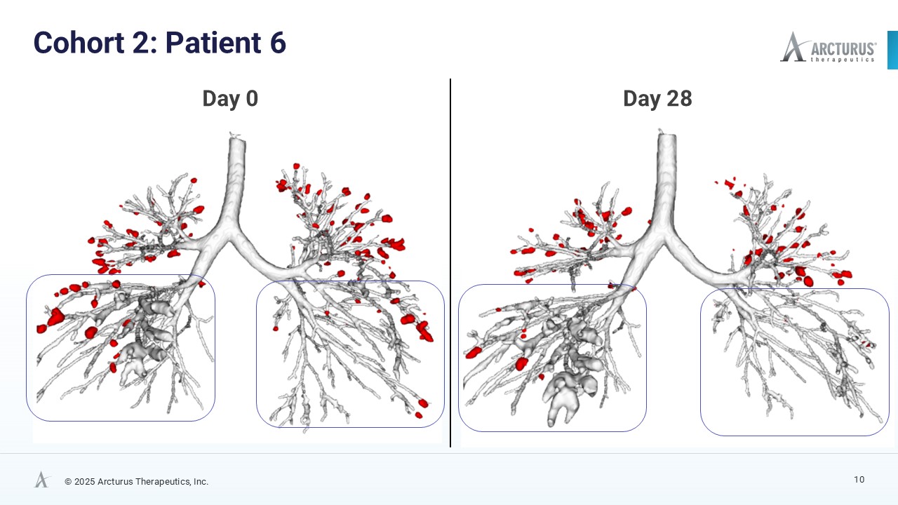 After only 28 days of treatment with ARCT-032 (10 mg), 4 out of 6 Class I CF participants exhibited encouraging reduction of mucus plug number and mucus volume