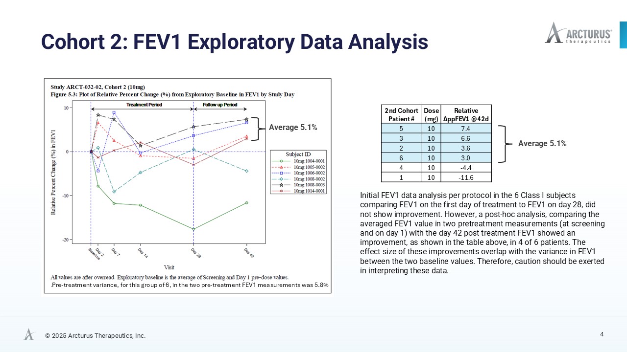 Initial analysis comparing FEV₁ values from Day 1 to Day 28 did not demonstrate meaningful improvement. However, a post hoc exploratory analysis comparing the average of two pre-treatment FEV₁ measurements (screening and Day 1) for the baseline with the Day 42 post-treatment value, assuming an extended activity of functional CFTR protein triggered by daily ARCT-032 administration, suggests improvements in lung function, in four of six Class I CF participants with an average absolute increase of 3.8% and a relative increase of 5.1% in percent predicted FEV₁ (ppFEV₁). While the magnitude of these changes falls within the range of natural variability of FEV1 measurements, such exploratory analyses can provide valuable directional signals, though they warrant cautionary interpretation. Full FEV1 data tables are available on Arcturus’ website.
