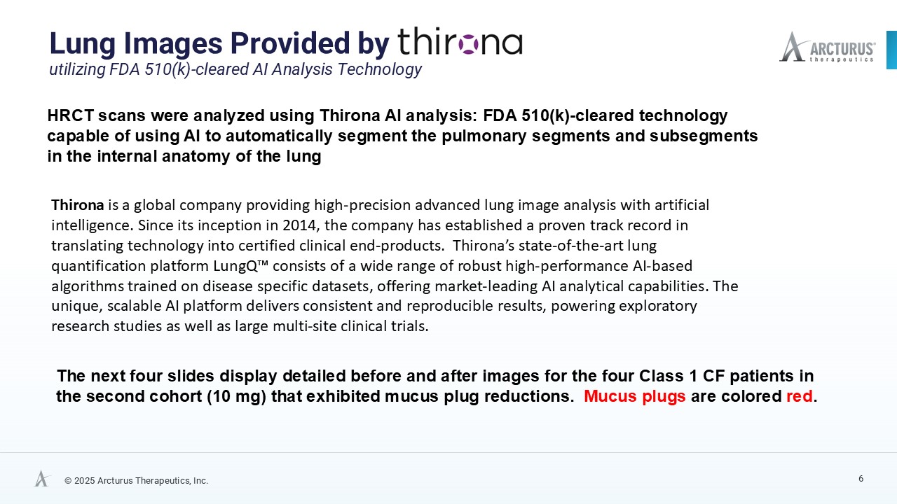 High resolution computed tomography (HRCT) scans, analyzed using FDA 501(k)-cleared AI technology from Thirona, revealed reductions in mucus burden in four of six Class I CF participants. Decrease in mucus plugs and mucus volume in four of six Class I CF participants is a meaningful trend indicative of ARCT-032 therapeutic activity. Before and after HRCT scan images of the four subjects that exhibited mucus plug reduction are available on Arcturus’ website.