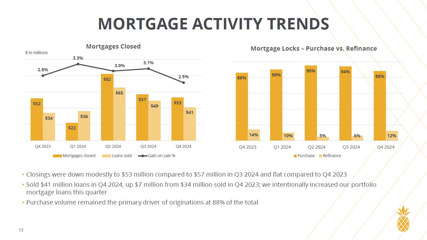 不良資産総額は、第 3 四半期の 0.28%、2023 年第 4 四半期の 0.10%から、2024 年第 4 四半期は 706 千ドル減少し、総資産の 0.27%となりました。2024 年第 4 四半期に新たに 4 件の債務不履行状態が発生しましたが、当四半期中に 7 件の債務不履行状態が発生または完済となりました。また、分類資産比率は、2024 年第 3 四半期の 4.35%から、2024 年第 4 四半期は 4.25%に低下し、2023 年第 4 四半期は 4.25%で横ばいでした。