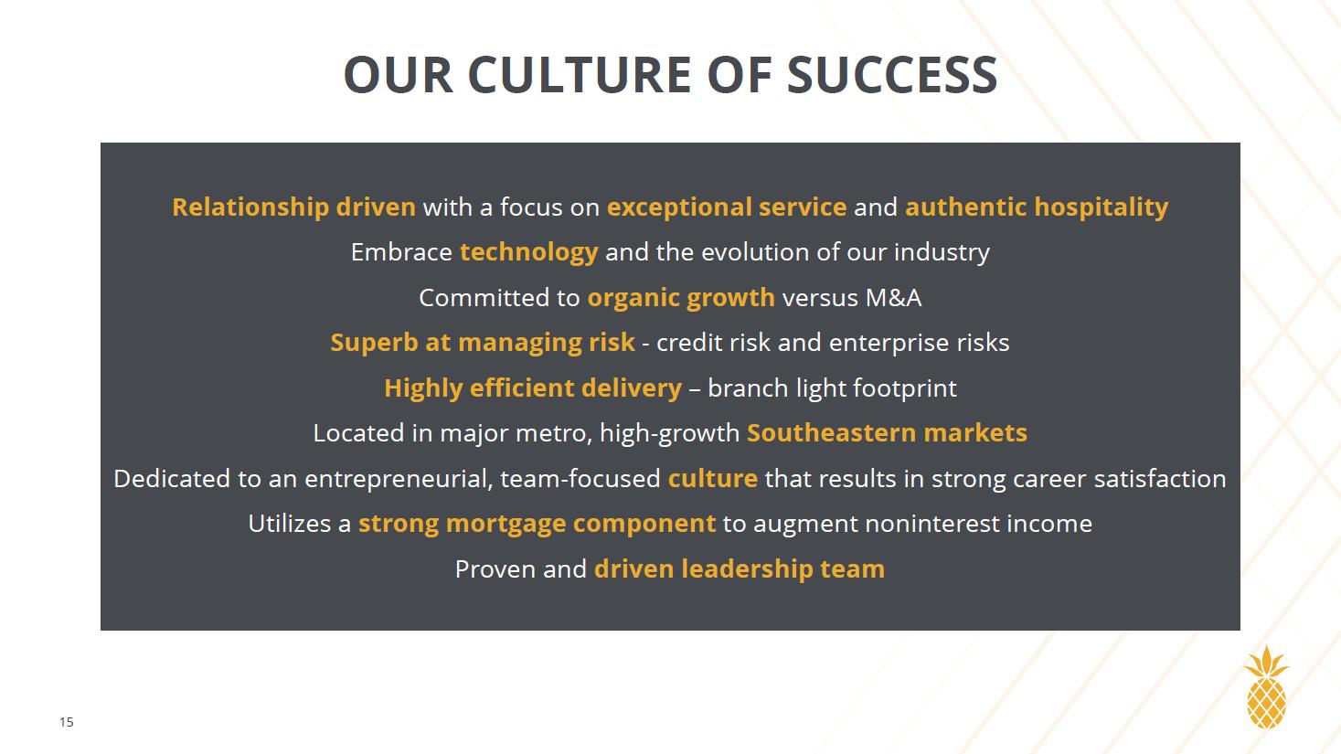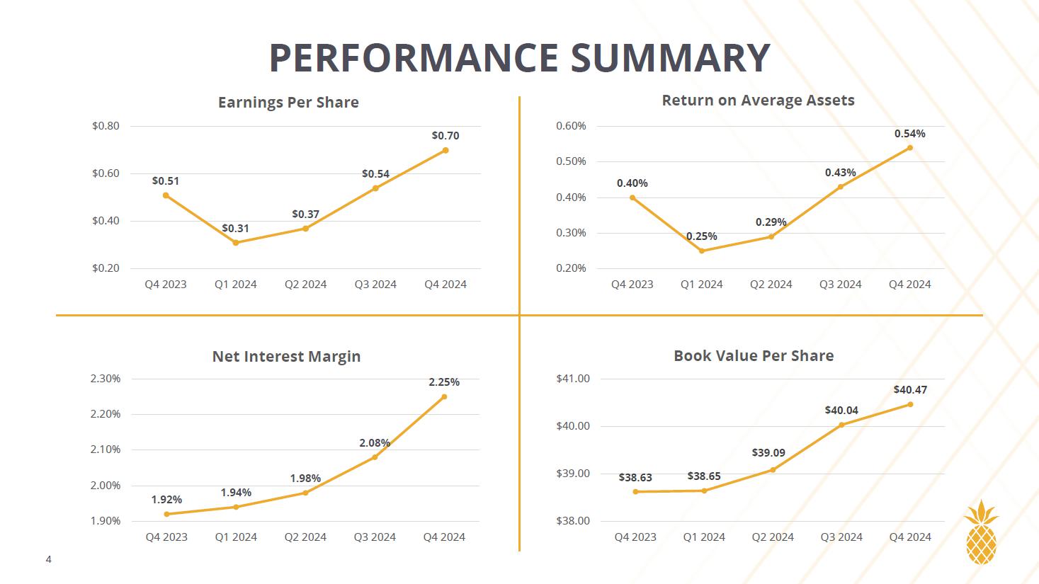 「今四半期の業績は、マージンの継続的なモメンタムを反映したものであり、2025 年に向けた出発点として大きな楽観を与えてくれる。資産の質は、優れたパフォーマンス指標と前向きな見通しにより、引き続き傑出しています。バランスシートはFRBの利下げで期待通りに機能し、利ざやは今期も四半期ごとに拡大しました。自己資本比率は引き続き高く、帳簿価額が40.47ドルに増加し、今年を締めくくることができたことに満足している」とアート・シーバー最高経営責任者(CEO)は述べた。「25年を経て、私たちが築き上げた会社と、私たちが奉仕する地域社会の人々の生活に影響を与えるという継続的な使命を誇りに思います。強固なバランスシートと健全なパイプラインにより、業績の好調を維持し、株主の皆様に価値を提供できる体制を整えています。
