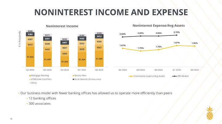 2025 年第 2 四半期の純金利収入は、270 万ドルの受取利息の増加により、前年同期比 190 万ドル増の 2,530 万ドルとなりましたが、支払利息の 759 千ドルの増加により一部相殺されました。受取利息の増加は、貸出金利回りが前四半期から 8bp 上昇し、売却したフェデラル・ファンドおよび有利子預金利回りが前四半期から 5bp 上昇したことに加え、有利子預金利回りが前四半期から 4bp 低下したことにより、利息獲得資産利回りが上昇したことによるものです。2024 年第 2 四半期との比較では、主に有利子預金コストが 60bp 低下した結果、純利息利益は 580 万ドル増加しました。2025 年第 2 四半期の純利鞘は 2.50%となり、2025 年第 1 四半期の 2.41%から 9bp 上昇し、2024 年第 2 四半期の 1.98%から 52bp 上昇しました。