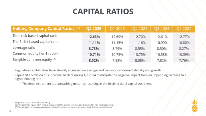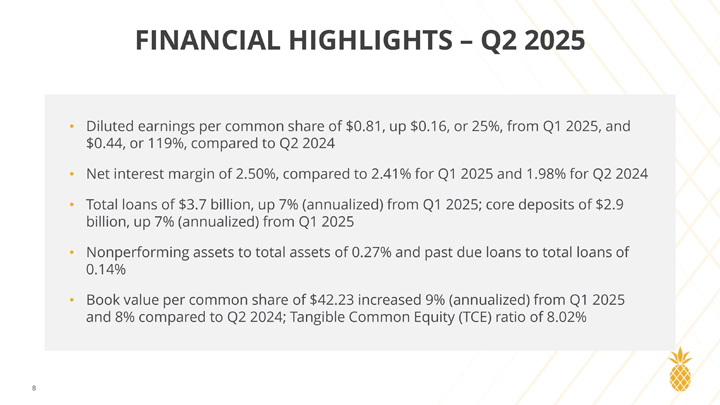 | · | 普通株式1株当たり簿価は42.23ドルで、2025年第1四半期比9%増(年率換算)、2024年第2四半期比8%増、有形普通株式(TCE)比率は8.02%。 |