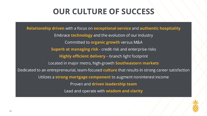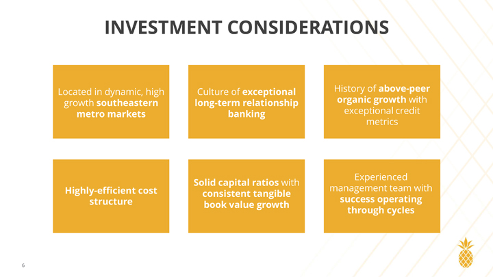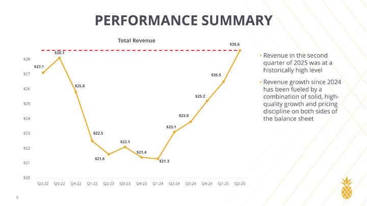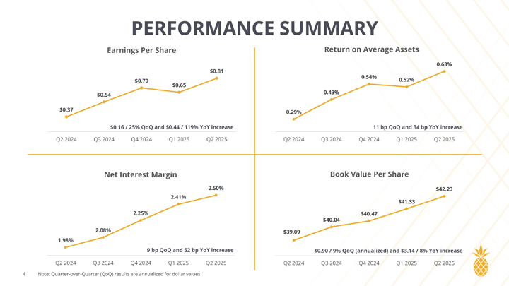 「第 2 四半期の業績は、活気ある市場において高品質で収益性の高い成長を生み出し続けている当チームの力強さを反映しています。当四半期も堅調なマージン拡大を達成しましたが、これは価格重視の姿勢とバランスシートの両側面における規律の賜物です。今期は25年の歴史の中で最も収益が高い四半期のひとつとなり、総収益は前年同期比で24%増加しました。当社の事業パイプラインは強固で、堅固なバランスシートに支えられながら、当面の健全な成長が期待できます。資産の質は業界トップクラスです。私たちは、より広範で刻々と変化する事業環境の潜在的な影響から免れることはできませんが、今年これまで実証してきたように、業績向上を実現する能力に自信を持っています」と最高経営責任者(CEO)のアート・シーバーは述べた。「今期は3名の新役員を迎えることができ、各市場に配置された新役員は、地域社会への貢献や専門的な知識など、素晴らしい経歴を持ち、すでに当社のリーダーシップに価値ある貢献を始めています。また、最高レベルの顧客サービスや地域社会サービスを提供することで、人々の生活に影響を与えるという当行の情熱を共有する、非常に優秀で経験豊富なバンカーも引き続き獲得しています。このような人材は、既存分野に厚みを持たせ、当行の事業領域を拡大する絶好の機会を提供してくれます。私たちは、今年とその先の展望に大きな熱意と楽観的な気持ちを抱いています。