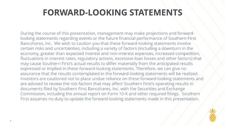 また、サザン・ファースト・バンクシェアーズ・インクの 2025 年 6 月 30 日期決算をハイライトしたスライド・プレゼンテーションのコピーは、本フォーム 8-K のカレント・レポートの別紙 99.2 として提出されています。このスライド・プレゼンテーションは当行のウェブサイト(www.southernfirst.com)の「投資家向け情報」セクションでもご覧いただけます。